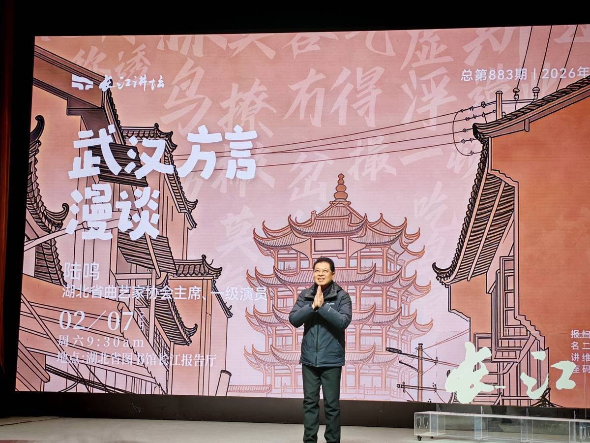 湖北日报讯(记者唐雪舟、通讯员彭知岛)“搞一餐,搞二两酒,搞一碗热干面,搞两个欢喜坨!”2月7日,长江讲坛迎来一位特别的讲课老师——湖北省曲艺家协会主席陆鸣。他没有用普通话,而是用一口地道的武汉方言,带来一场充满笑声与掌声的“武汉方言课”。现场观众在熟悉的乡音中,跟着陆鸣一起咵天,在俚语俗话里触摸武汉历史的脉络。