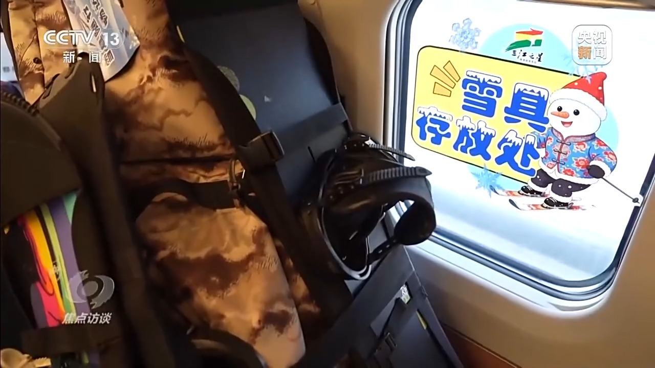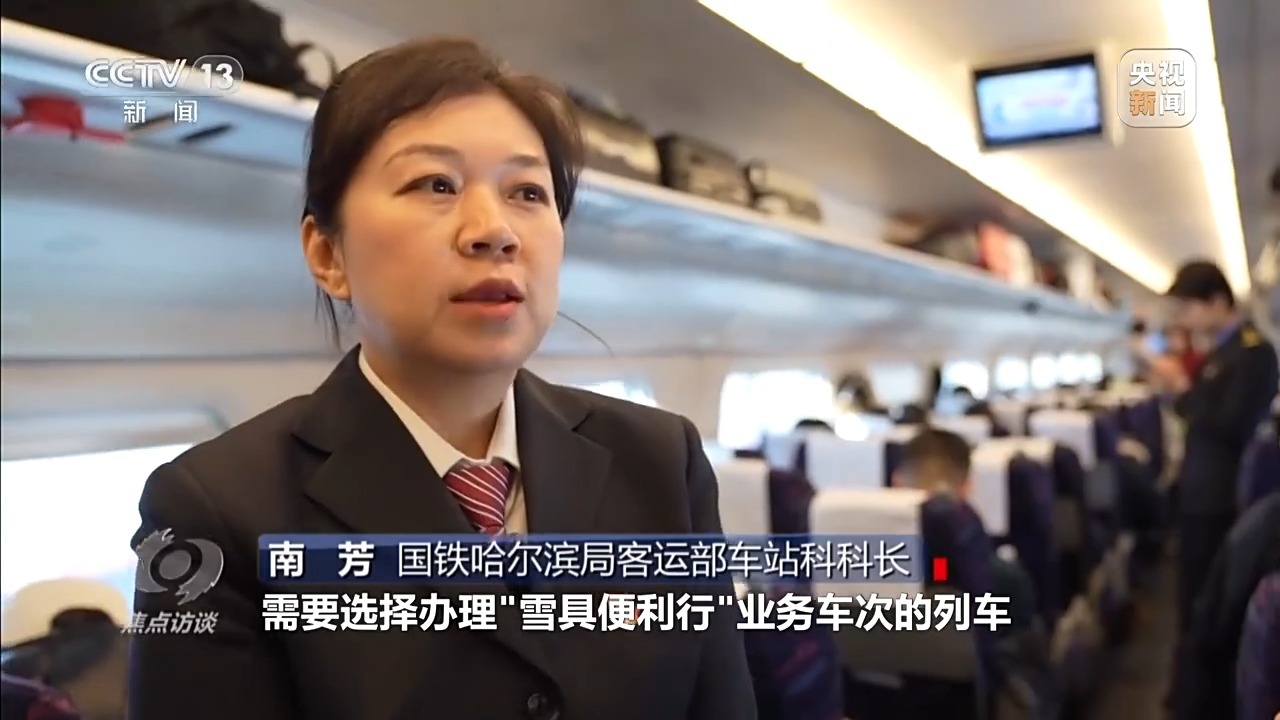 国铁哈尔滨局客运部车站科科长 南芳:春运期间,客流比较大,如果有携带雪板出行意愿的旅客,需要选择办理雪具便利行业务车次的列车,并且办理预约。下一步也会根据雪具便利行的试行情况,统筹考虑旅客座位需求和旅客携带雪板需求。