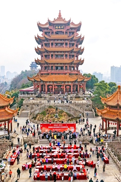 今年的活动主会场布置别具巧思,近百张书法桌在黄鹤楼主楼前广场排成“春”字造型,从高处俯瞰格外壮观。这一匠心设计不仅营造出浓厚的节日氛围,更蕴含着“江城春早”“文化长春”“家国同春”的美好寓意,寄托了对城市发展、文化传承和国家繁荣的诚挚祝愿。