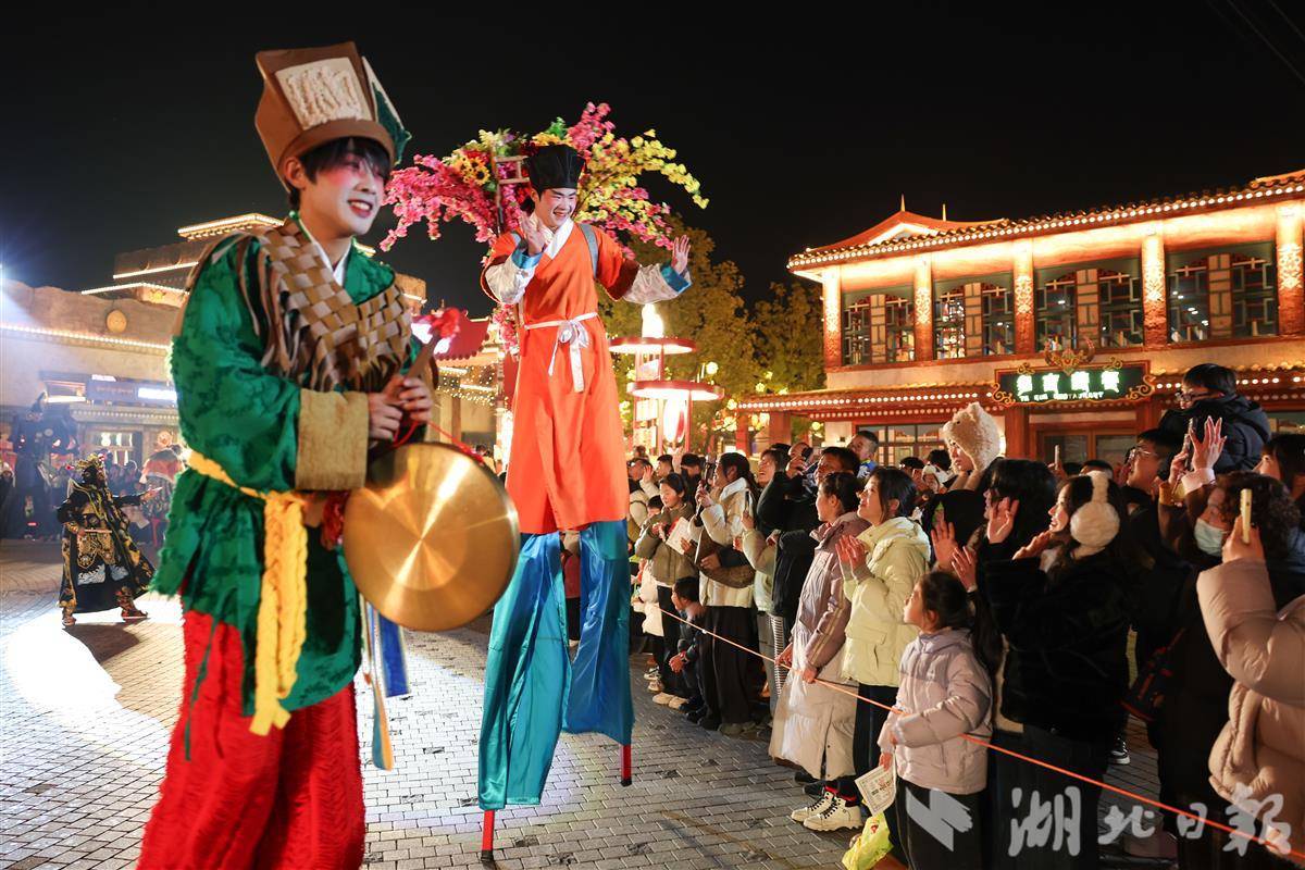 民间艺人在襄阳市奇幻新春庙会上表演高跷。