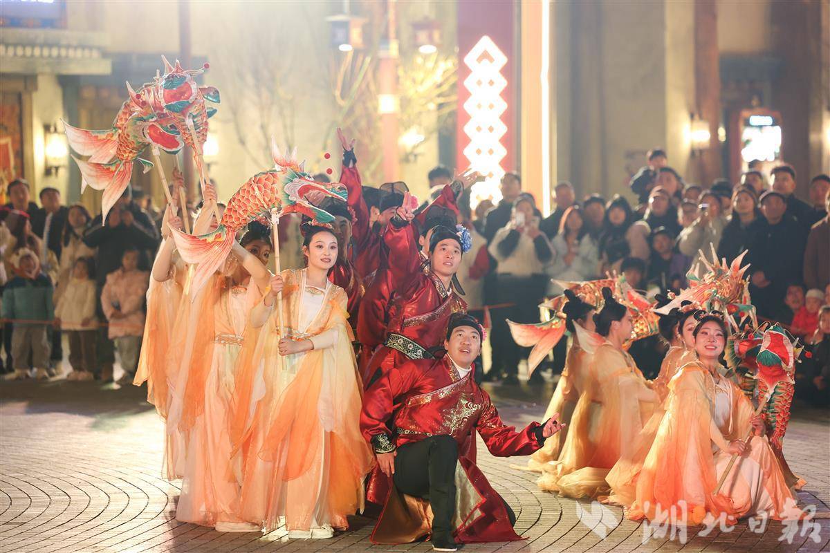 游客在襄阳市奇幻新春庙会观看鱼灯表演。