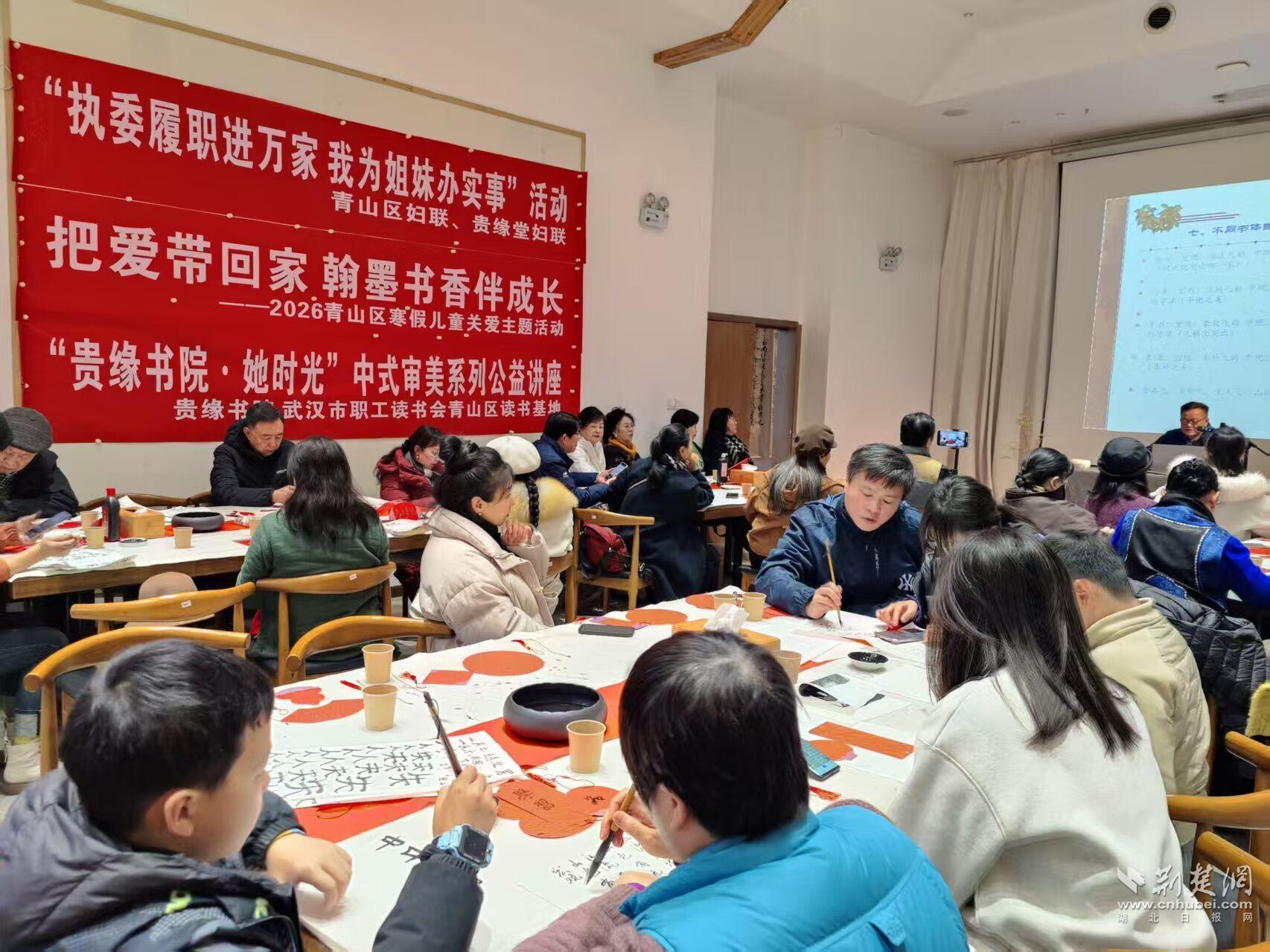 荆楚网(湖北日报网)讯(通讯员 叶旻)2月7日下午,青山区“把爱带回家 翰墨书香伴成长”寒假儿童关爱主题活动成功举办。15组中小学生亲子家庭以及红卫路商圈妇联执委齐聚一堂,在书法家张炳绍老师的带领下,以笔为媒,以墨为介,开启了一场浸润东方美学的亲子文化雅集。