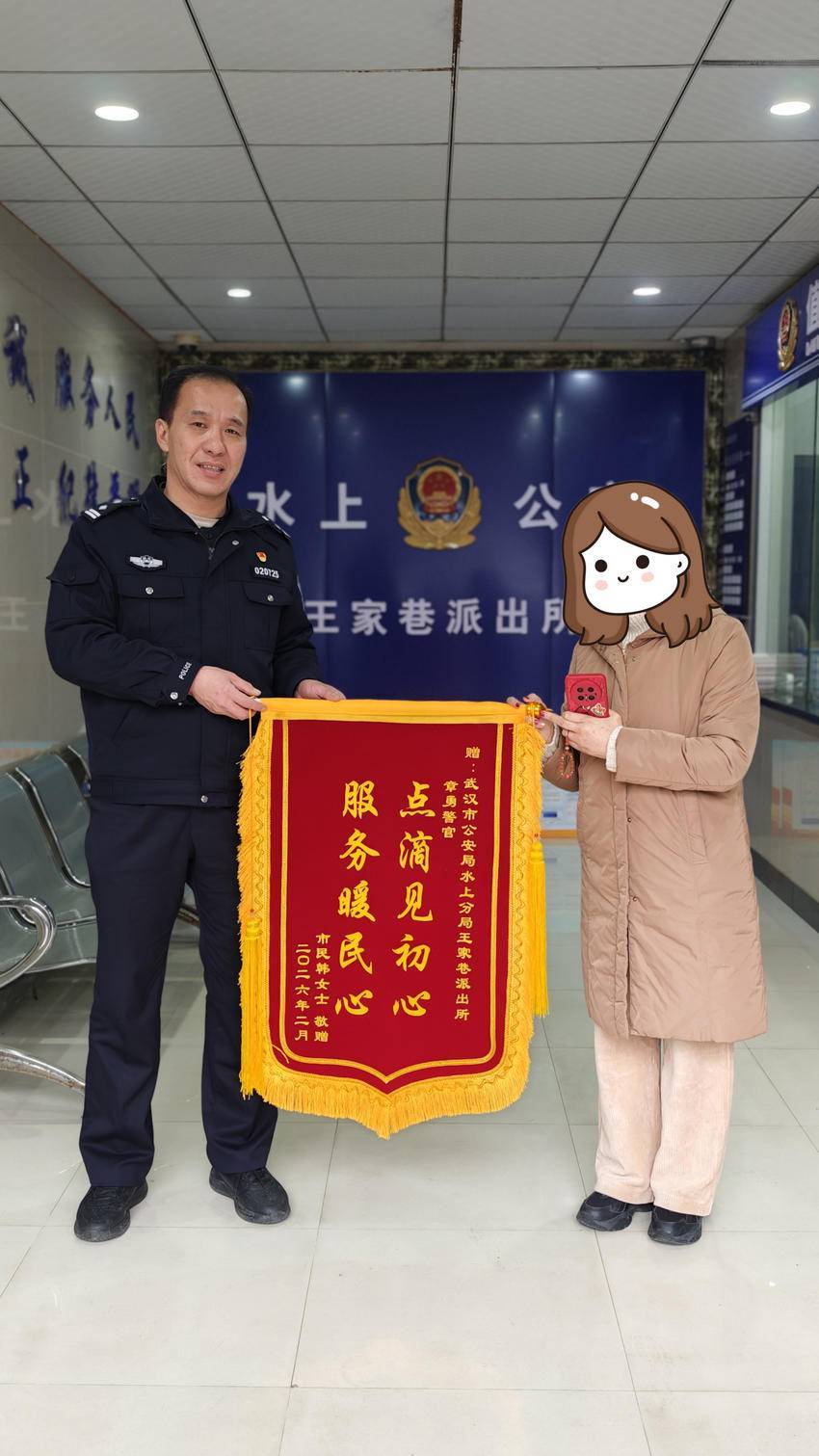 2月9日上午,韩女士在家人的陪同下,专程来到王家巷派出所,将一面印有“点滴见初心 服务暖民心”的锦旗送到章勇手中,表达感谢之情。面对韩女士的再三道谢,章勇只是朴实地说:“不谢,这是我们应该做的!”