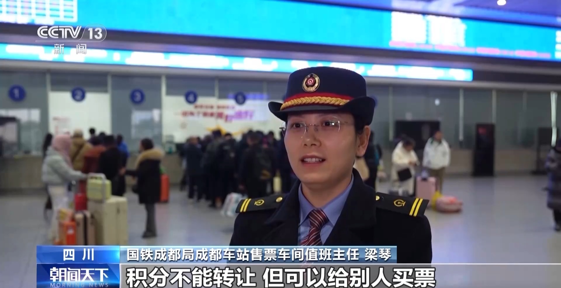 国铁成都局成都车站售票车间值班主任 梁琴:积分不能转让,但可以给别人买票,每名会员最多可设置8名受让人,受让人须通过身份信息核验,且添加成功60日(含当日)后才能生效。
