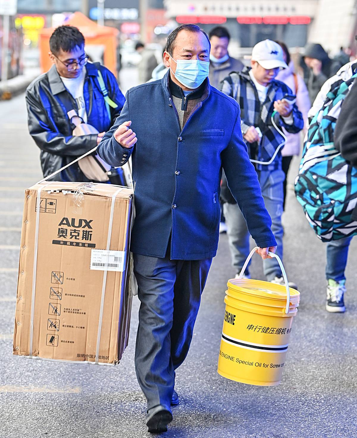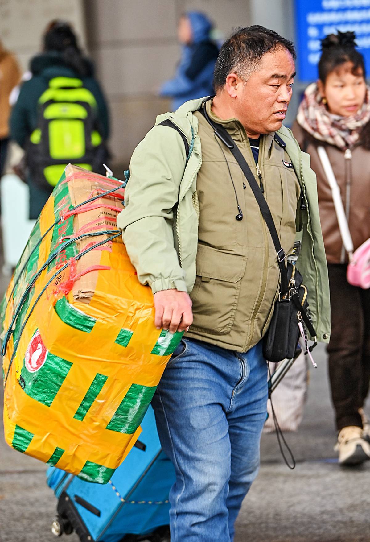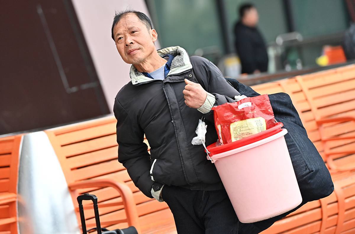 床单包裹的或许是孩子惦记许久的新衣和玩具,塑料桶变行囊随行千公里是藏在骨子里的勤俭。(湖北日报全媒记者 朱熙勇 摄)