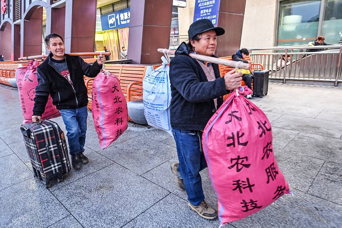 2月9日,武昌火车站,旅客带着大包小包行李返乡,有的或扛或挑沉甸甸的蛇皮袋,手提塑料桶,有的肩背用床单打包的行囊,看似简陋的装备,装满的是深厚的生存智慧与情感温度。