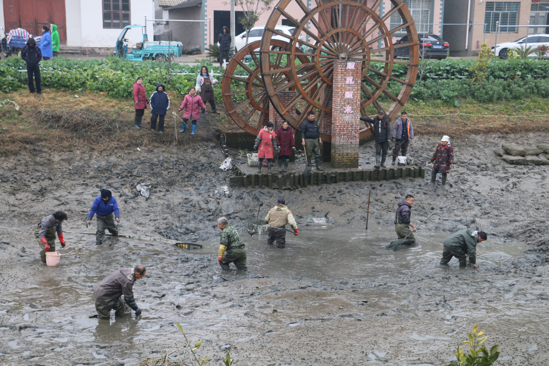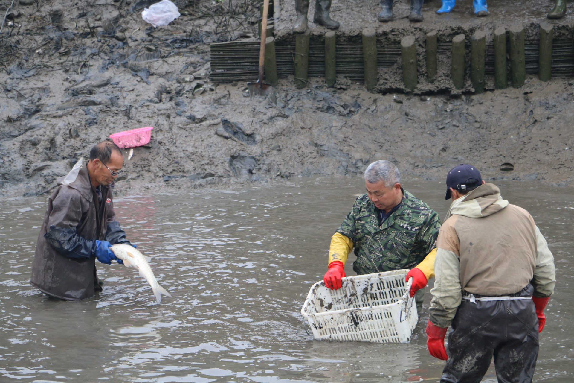 “这条草鱼真大!”居民张小华和邻居们默契配合,将刚捞起的草鱼放入袋子里拖向岸边。经过一天一夜的持续抽水,鱼塘水位已降至适宜捕捞的深度,肥硕的草鱼、鲢鱼在鱼塘中活蹦乱跳,天气虽然寒冷,却掩不住居民脸上的笑容。