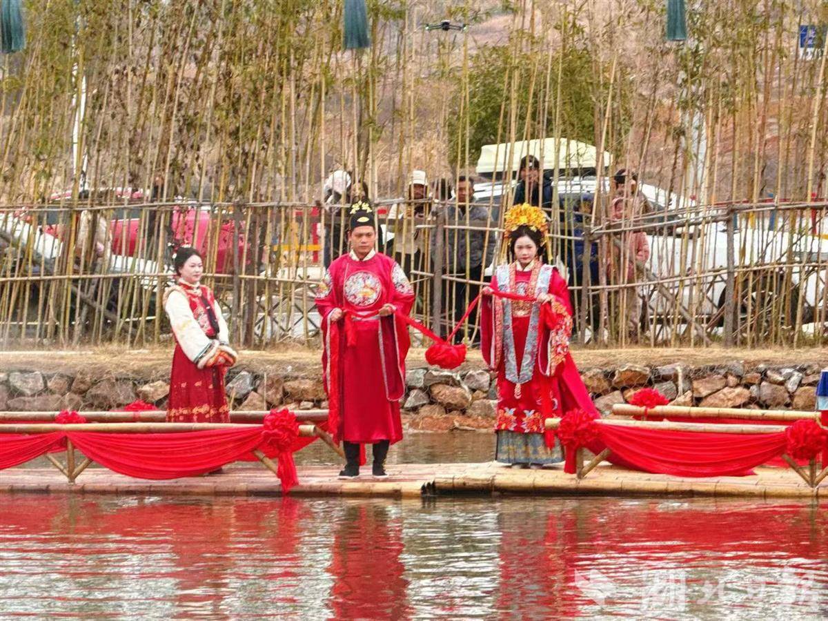 前不久,街区预排了一场“明制婚礼”巡游秀。水面烟气氤氲,两位船夫各撑一条竹编窄船,从水深处驶来,身着明制婚服的男女互相拜首。登临岸上,在街区内开启一场浪漫巡游,游客自发跟随,队伍越拉越长。