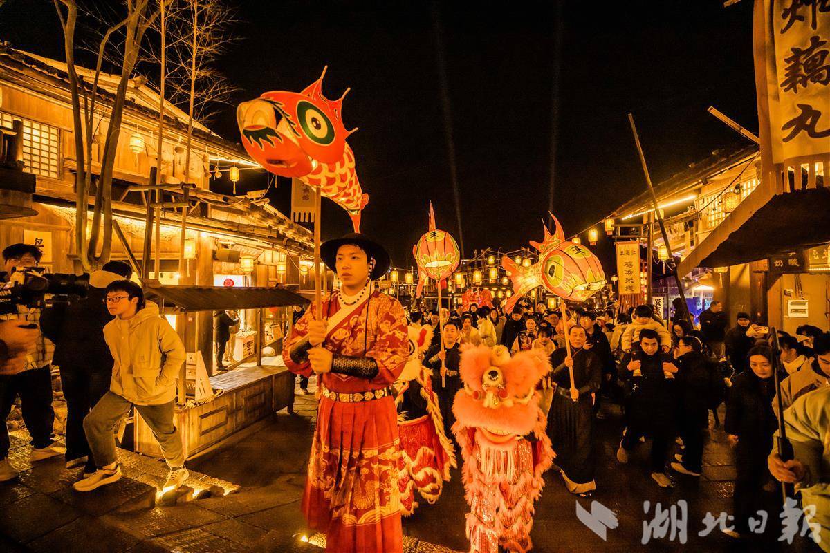 2月8日晚上8点左右,古风古色的丝竹声响起,“江夏里·武汉老码头文化美食街区”内的仿古街巷眨眼间被千盏花灯吞没。李白在游船上吟诵,数十位身着古装的演员高举着游鱼般的灯盏,从翘首以待的人群中蜿蜒穿过。