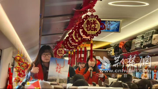 列车平稳行驶后,温馨活动正式拉开帷幕。联通公司李兰月的一曲《常回家看看》开场,熟悉的旋律勾起了众人的思乡之情,不少人跟着轻轻哼唱;互动小游戏“年味接龙”环节中,全员参与,轻松又解压;小朋友演唱的《新年好》和老乡曹昌云表演的歌曲《暖暖》,现场掌声不断,车厢内气氛热烈又欢乐。