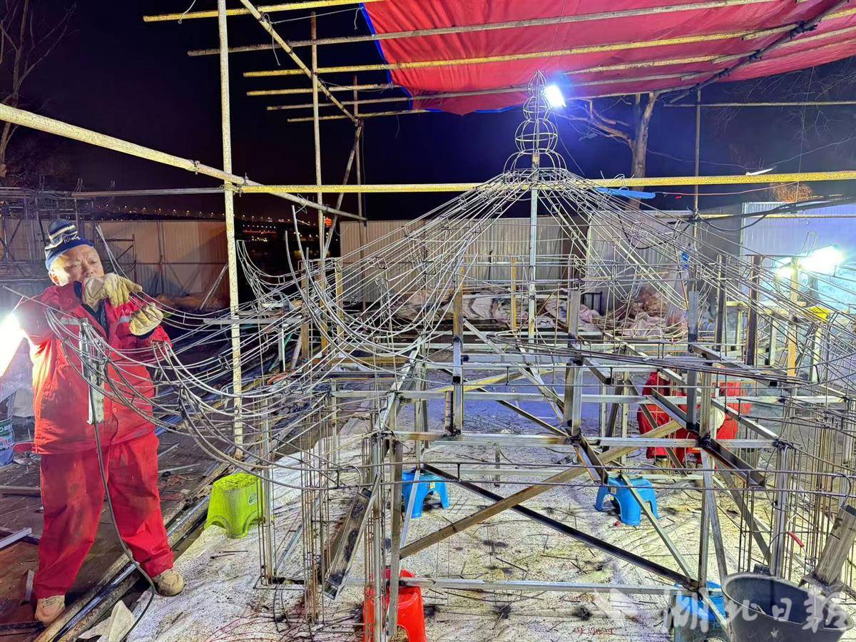 此次晴川灯会,邵宗高首次挑战制作“黄鹤楼”花灯,以明末清初的黄鹤楼为参照,仅焊接造型这一个环节,就用了10天。