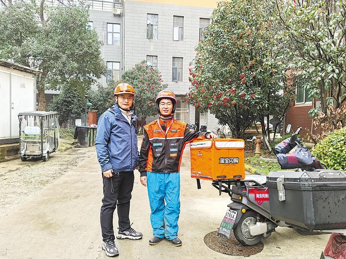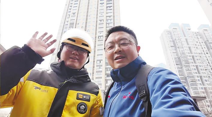 湖北日报全媒记者与外卖小哥赵承军(右)一起送餐。