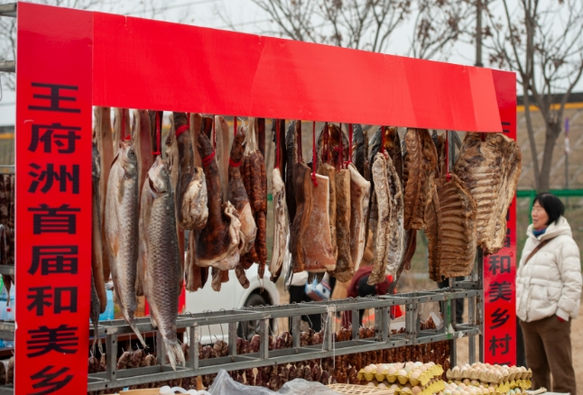 商户吴晓慧的摊位上摆满了樊庄的腊排骨、腊蹄子、土鸡蛋、芝麻叶等农家货。“我就想借着这股劲儿,把咱家乡的好东西卖出去,让更多人尝尝咱樊庄的地道滋味!”她说。