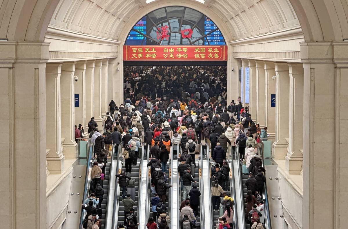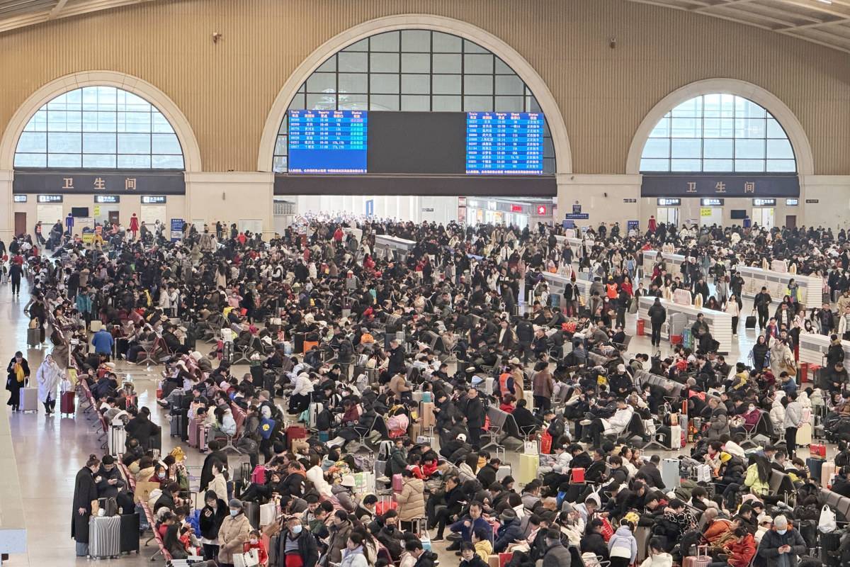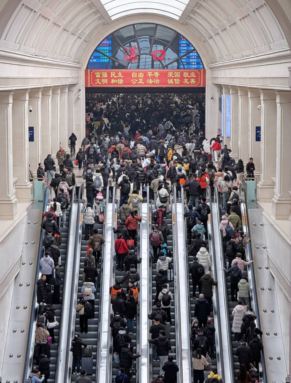 2月11日,春运进入第十天,武汉三大火车站——汉口站、武汉站、武昌站预计发送旅客总量将达65万人次左右。其中,汉口火车站作为重要的铁路枢纽,客流尤为密集,迎来节前出行高峰。 上午的汉口火车站内,返乡人流明显增多。候车大厅座无虚席,安检口、检票闸机前排起长队。拖着行李箱、背着年货的旅客脚步匆匆,脸上洋溢着回家的期盼。车站已加强引导,保障旅客有序出行。(湖北日报全媒记者 李溪 摄)