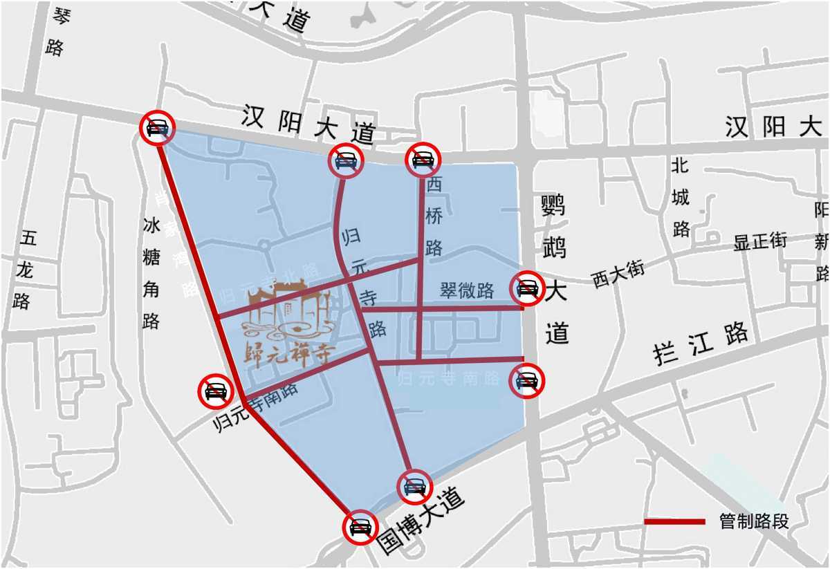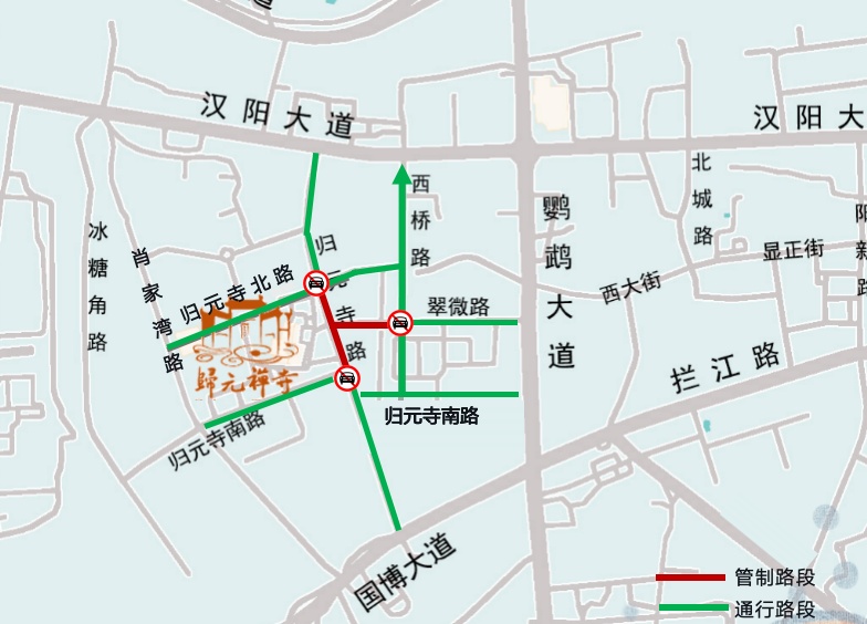 2月18日(初二)、2月19日(初三)、2月20日(初四)、2月22日(初六)、2月23日(初七)每日7:00至17:00,归元寺路(归元寺南路至归元寺北路)、翠微路(归元寺路至西桥路)禁止机动车及非机动车通行和停放。