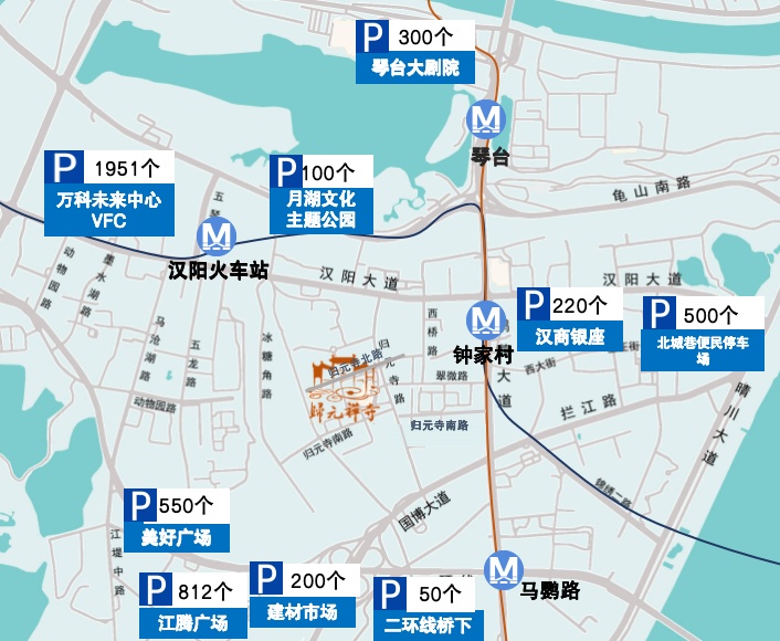 自驾前往归元寺的市民游客,可将车辆停放在周边9个停车场——琴台大剧院、月湖文化主题公园、鹦鹉洲建材市场、美好广场、江腾广场、万科未来中心VFC、二环线桥下、汉商银座地下停车场、北城巷便民停车场,共计可提供车位4683个。