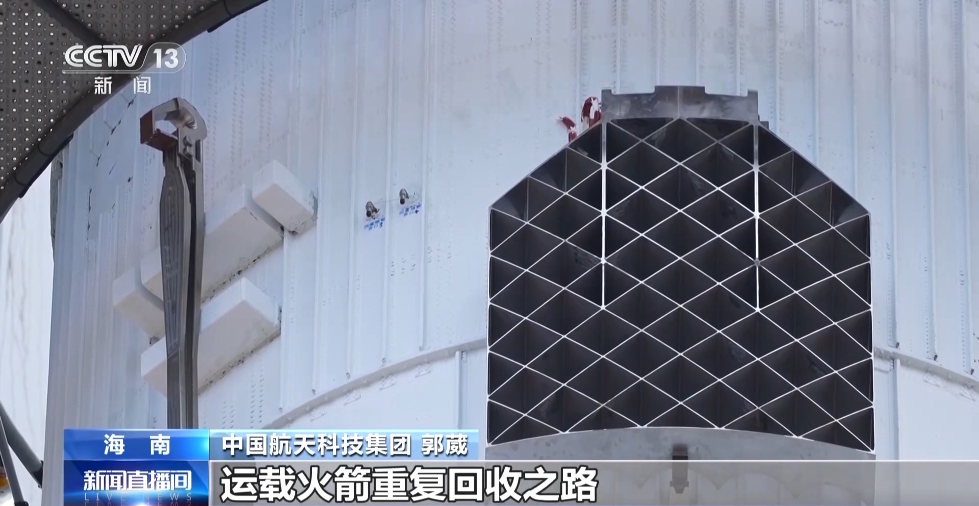 中国航天科技集团 郭葳:从功能上来讲,明显的上面那个方方正正的栅格舵,这是可重复使用火箭的标配,用于整个气动控制。可以说这是目前是国内最大的一个栅格舵了,一片基本上差不多相当于一个双人床大小。然后其次上面是有两个小爪子,那个东西就是挂索机构。