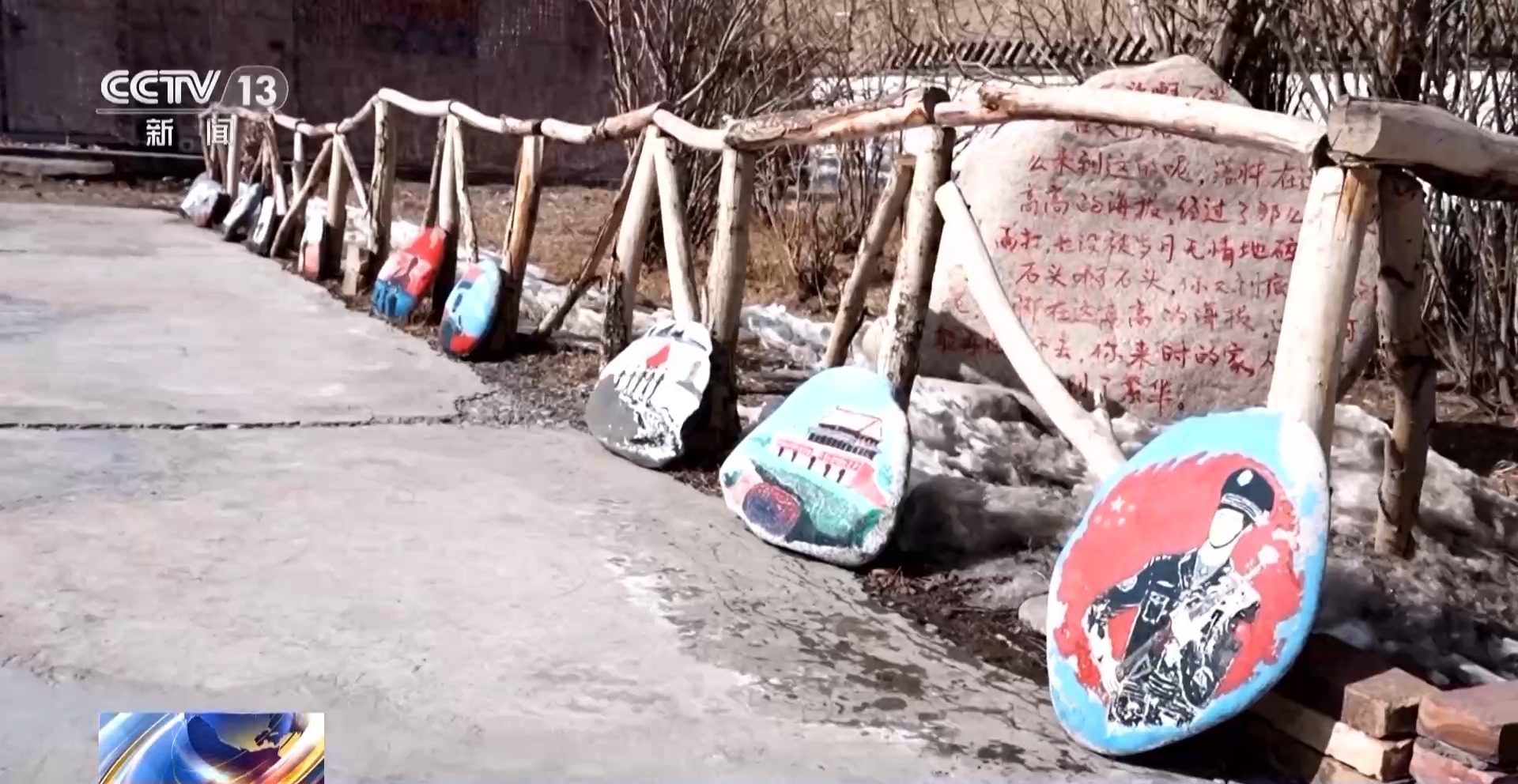 在这些石头上,生动地画着界碑、雪山、蓝天、巡逻场景等,五颜六色的石头画,展现着民警们戍边的铮铮誓言。而袁啸已经画好的那块石头,传递着对爷爷的思念和牵挂。