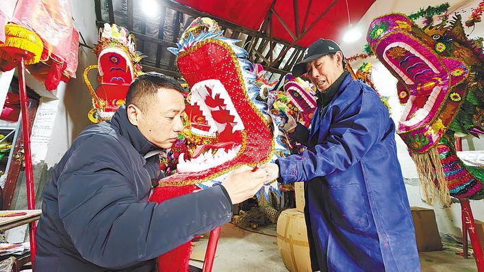 2月10日,农历腊月二十三,在武汉市黄陂区六指街道罗家岗村的一个小作坊里,昂然的龙灯、威猛的狮子头、喜庆的采莲船,栩栩如生,满屋喜气。