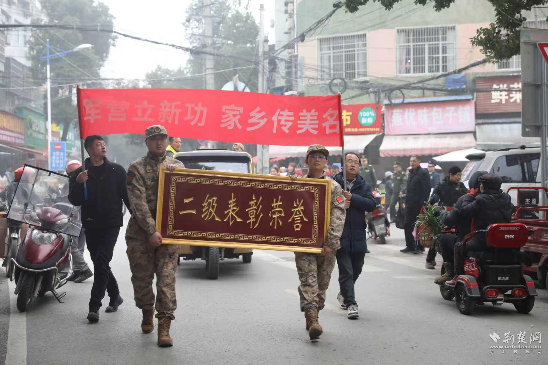 清晨,浠水县清泉镇河东街村锣鼓喧天、气氛热烈。在军地领导的共同见证下,胡志刚身披绶带、胸戴红花,在腰鼓队的欢庆声中,与军地领导一道步行返回家中。军地领导向其家庭颁授“二等功臣之家”牌匾,并送上慰问金。随后,领导与胡志刚及其家人进行了亲切座谈,详细了解他在部队的训练生活情况,对其取得的优异成绩表示祝贺,并感谢家人一直以来的理解与支持。胡志刚激动地表示,荣誉属于部队培养,今后将继续努力,为国防事业再立新功。