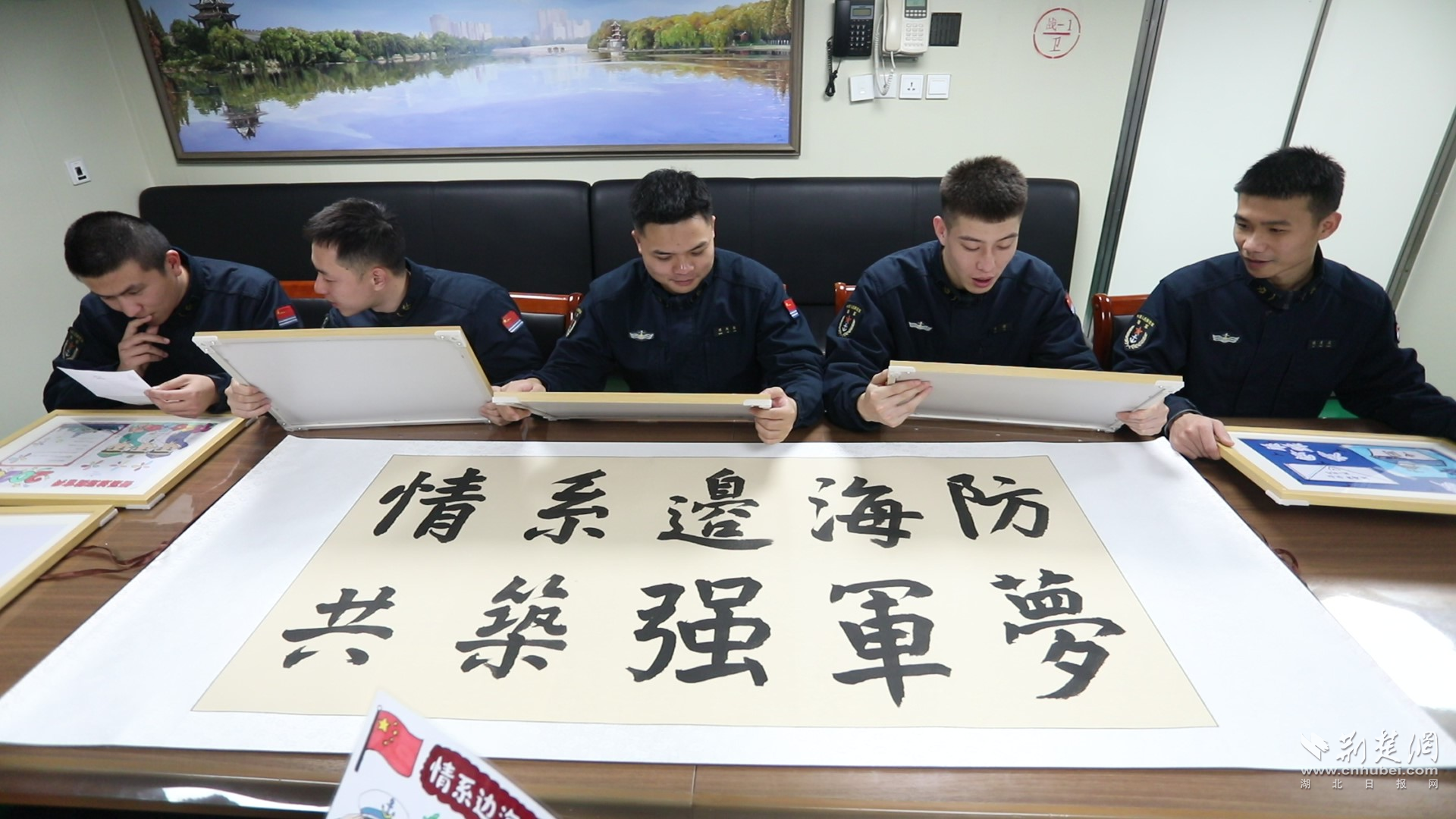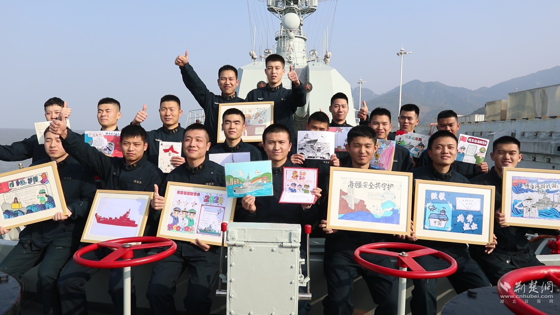 学生代表们手持自己的作品,面向镜头表达心声:“襄阳舰的叔叔阿姨,谢谢你们守护祖国!祝你们新春快乐,平安健康!”