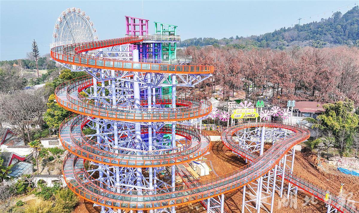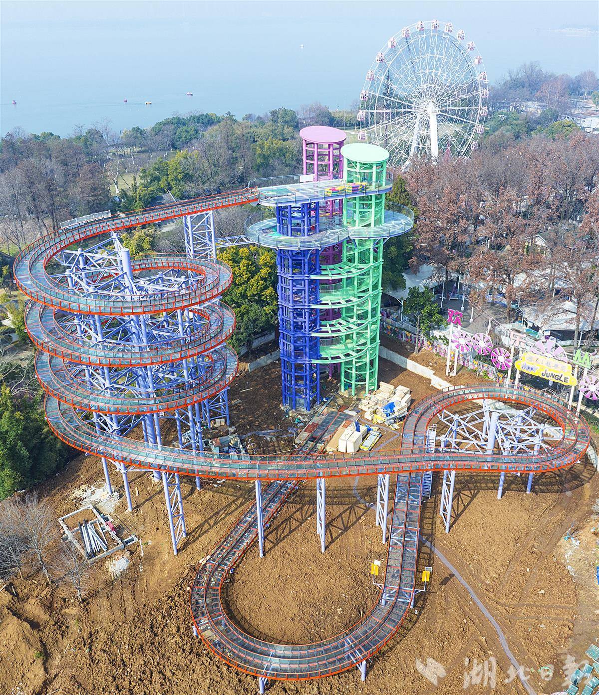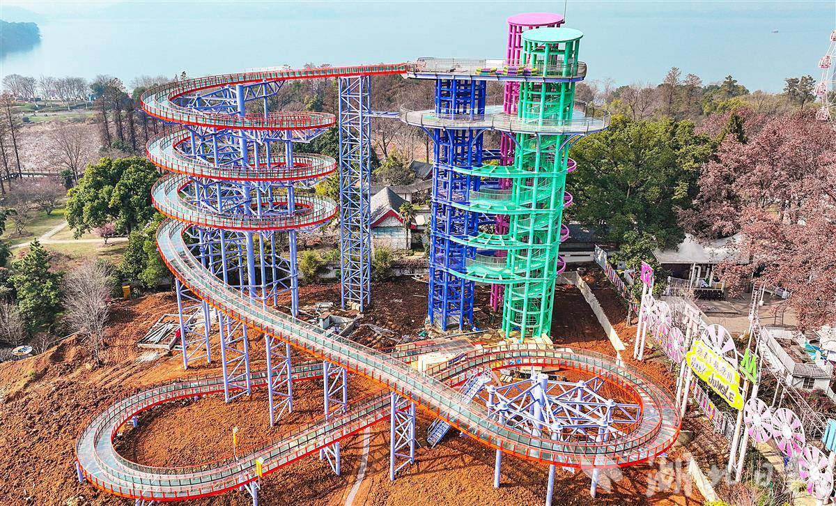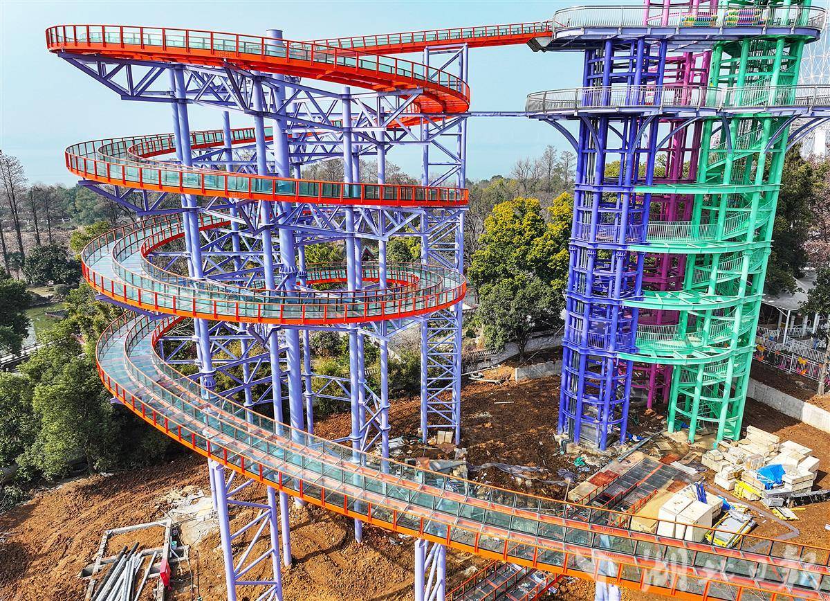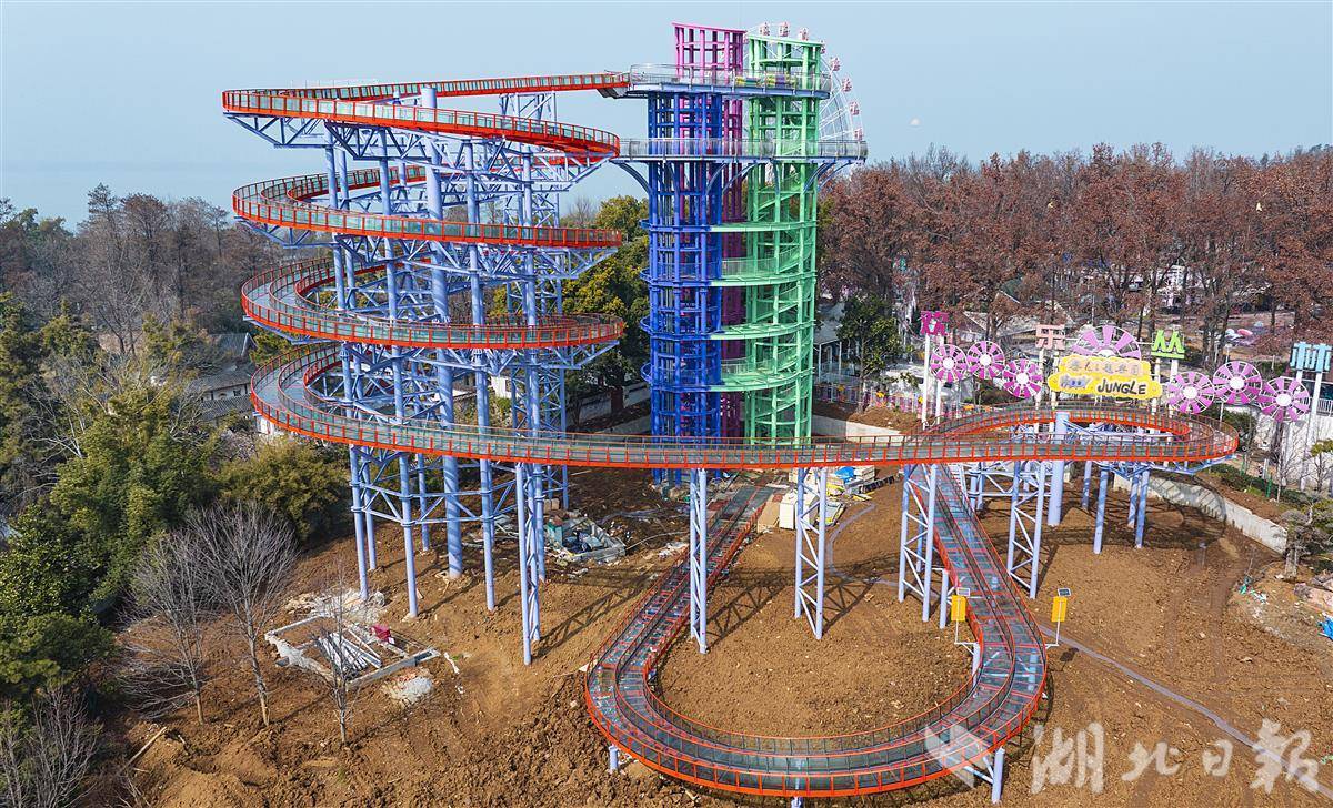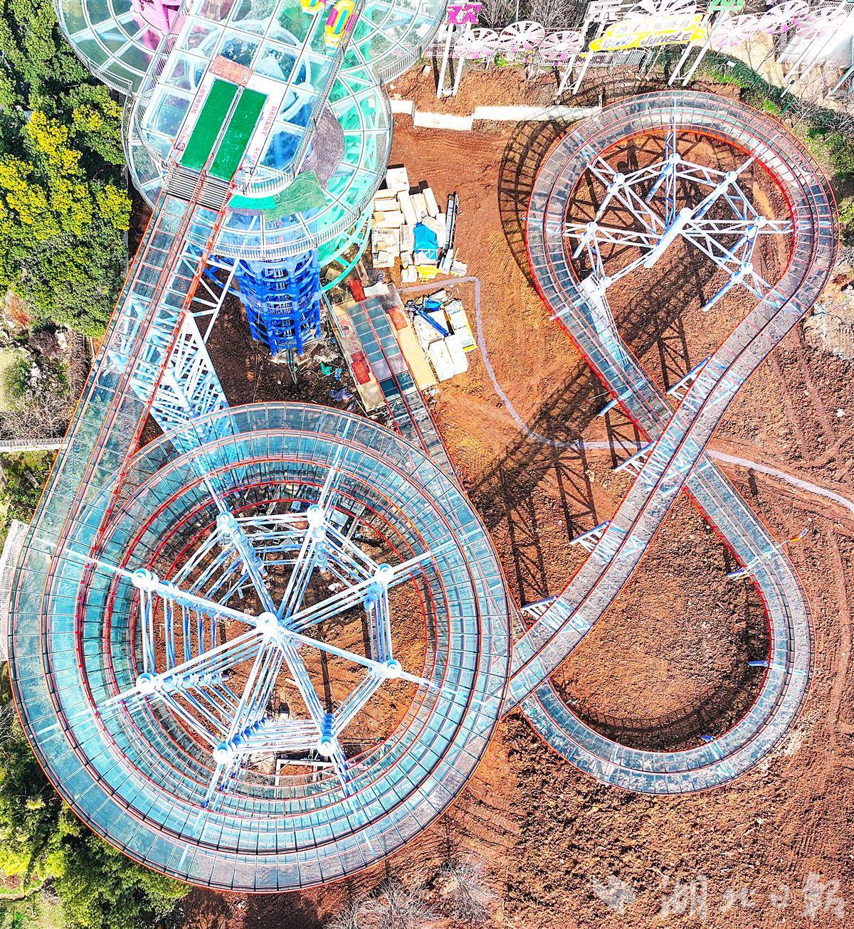 2月11日,鸟瞰武汉东湖磨山玻璃水滑道项目,这座形如“螺丝”型的滑道,高度30米,玻璃双滑道,长365米。目前,滑道主体工程已完工,春节后将进入人工湖的施工阶段。