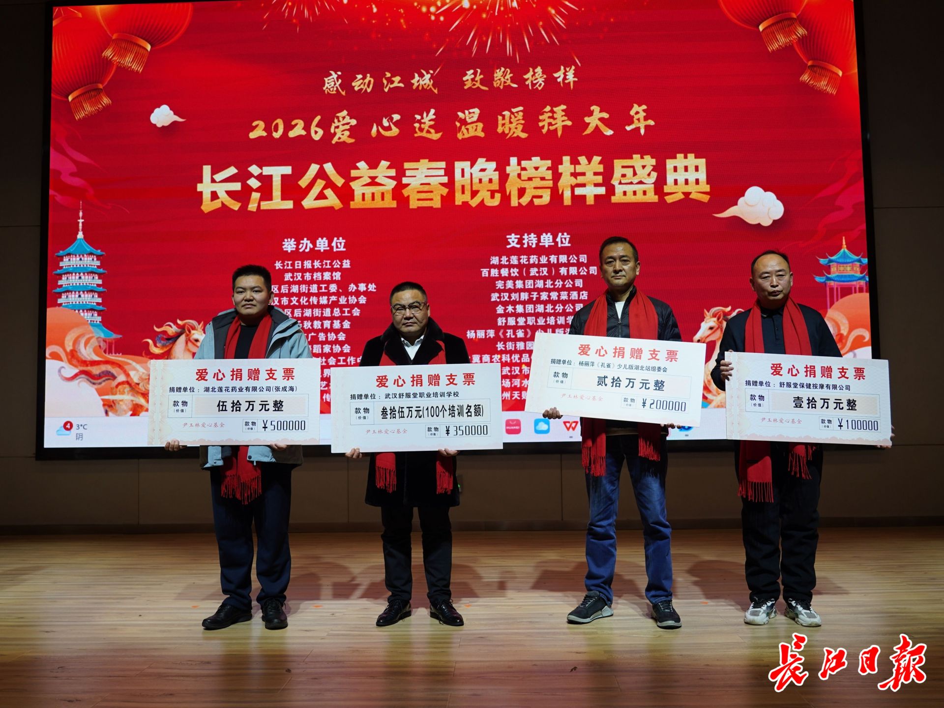 年味渐浓,爱心先行。1月30日下午,长江公益联合武汉市档案馆,江岸区后湖街道工委、办事处,江岸区后湖街道总工会,武汉市文化传媒产业协会、武汉市广告协会、武汉市舞蹈家协会、华夏千秋教育基金、湖北爱心天使社会工作中心、武汉榜样视界文化、长江公益艺术团等,组织2026“送温暖拜大年”首批爱心年货集中发放活动,大家现场还与全国道德模范吴天祥、王争艳,全国劳模、湖北省慈善总会副会长甘金华等一起观看公益演出。