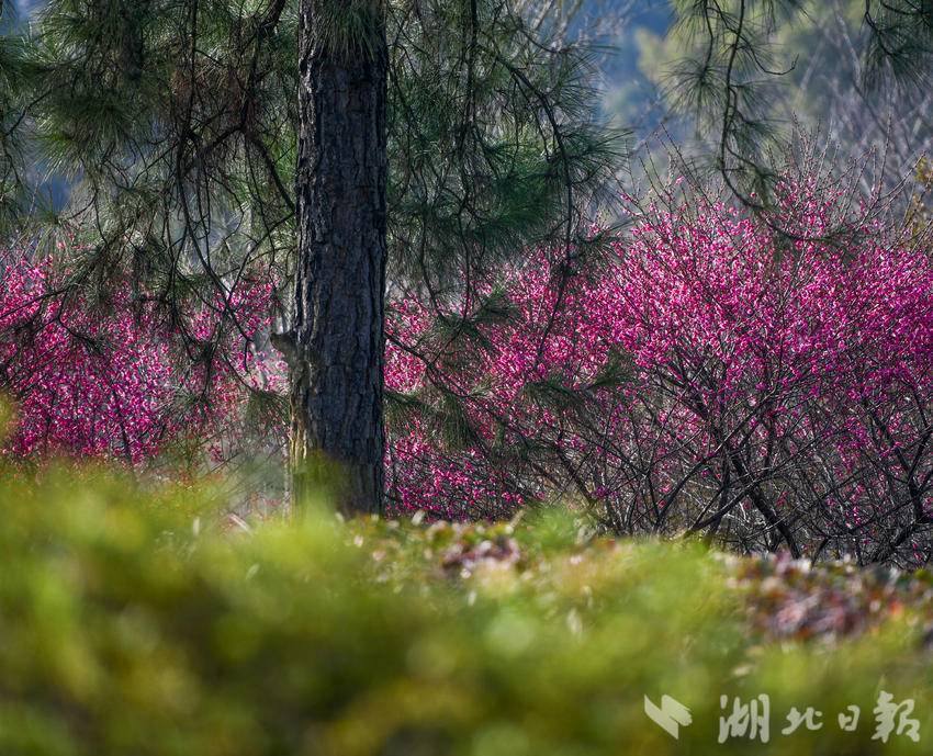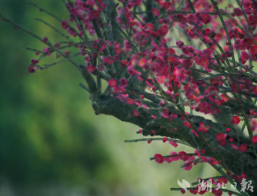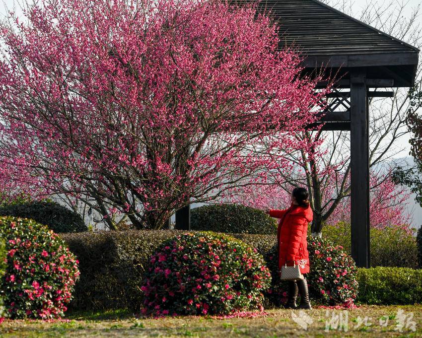 远远望去,红梅如云霞般漫卷,走近细看,花朵玲珑剔透,红得既热烈又端庄。