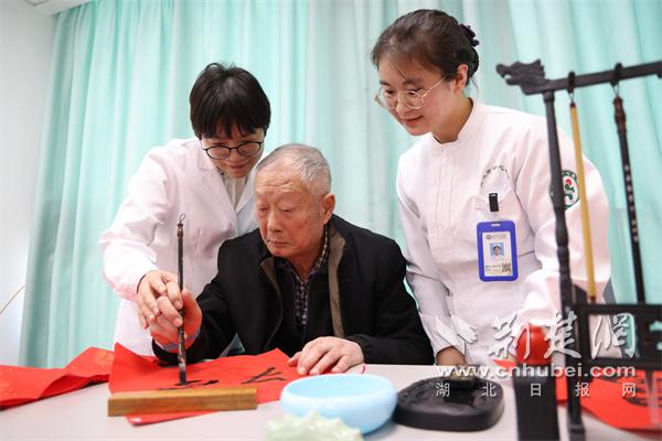 下午三点,活动准时开始。在病区临时建起的“巧手纳福工作坊”里,医护人员和患者一起剪窗花;有书法特长的医生带着几位患者和家属挥毫写“福”字;还有患者和医护人员一起,小心地将药材装入绸袋,系紧口子,做成清香缕缕的香囊。