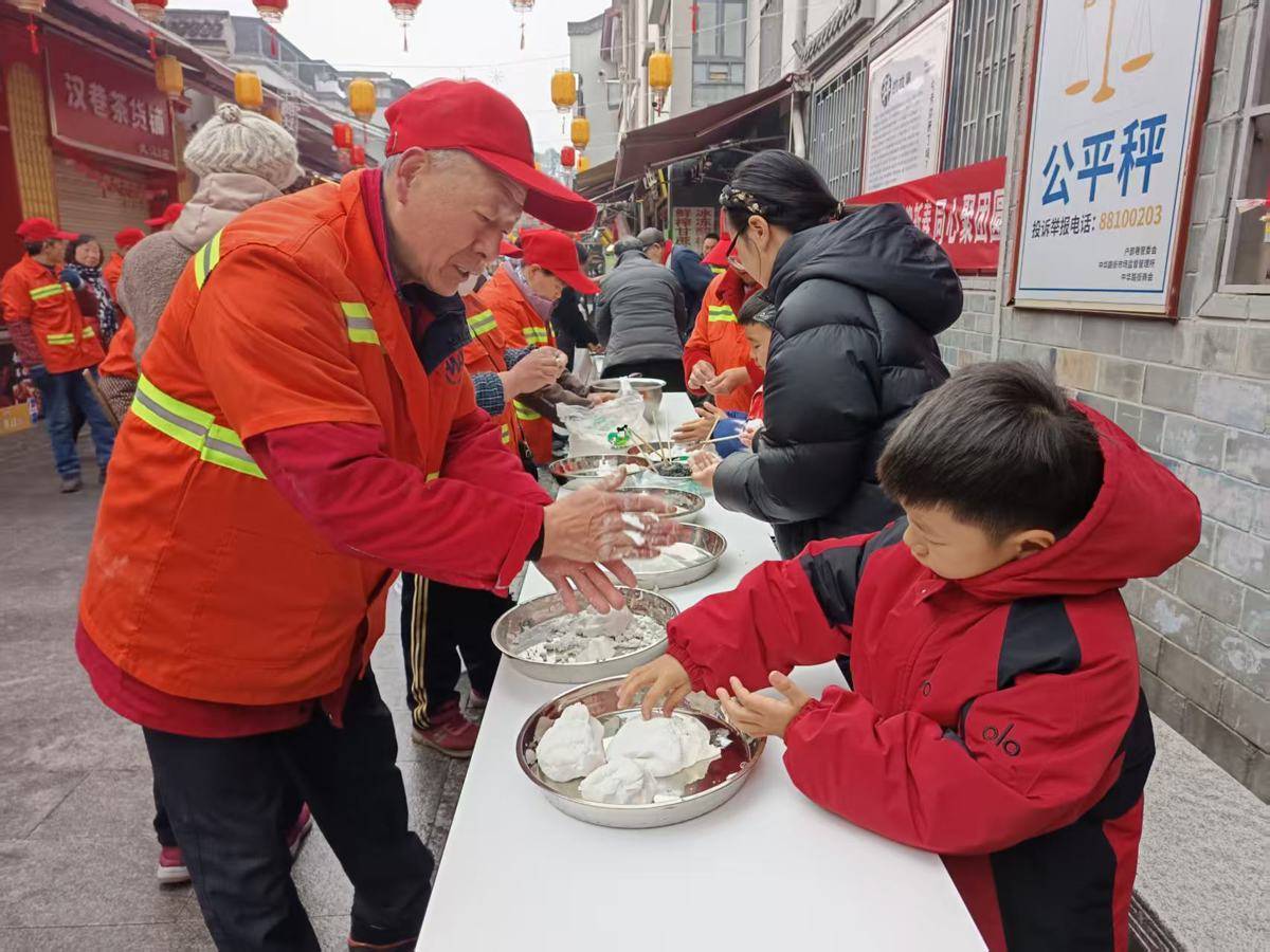 这场暖心家宴,是“骐骥迎新春 同心聚团圆”主题活动中的“重头戏”。活动由武昌区中华路街道办事处户部巷管委会主办,中华路街道工会联合会、户部巷社区等单位联合协办。现场处处藏着温情细节,红巷艺术城的书法老师挥毫泼墨,一副副墨香春联、喜庆福字送到每位参与者手中;“户部小侍郎”志愿者们踮着脚,和环卫工人一起揉面团、包汤圆,孩童的嬉笑声与长辈的叮嘱声交织,成了动人的年味风景。