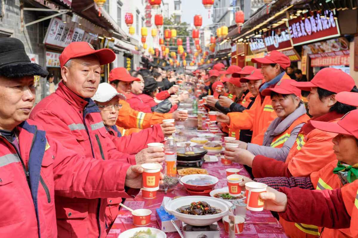 “这次活动初期,商户们听说要请一线劳动者吃团年饭,都主动来帮忙。”户部巷管委会副主任葛倚兵介绍,此次活动主要是为了关心环卫、城管等一线户外工作者,在节假日期间,他们为了能够给游客商户提供干净整洁有序的街区环境,牺牲了自己的假期时间,所以借举办团年宴的契机对他们表示感谢,也用一场团聚凝聚多方力量,焕发街区新生机、展现街区新活力。