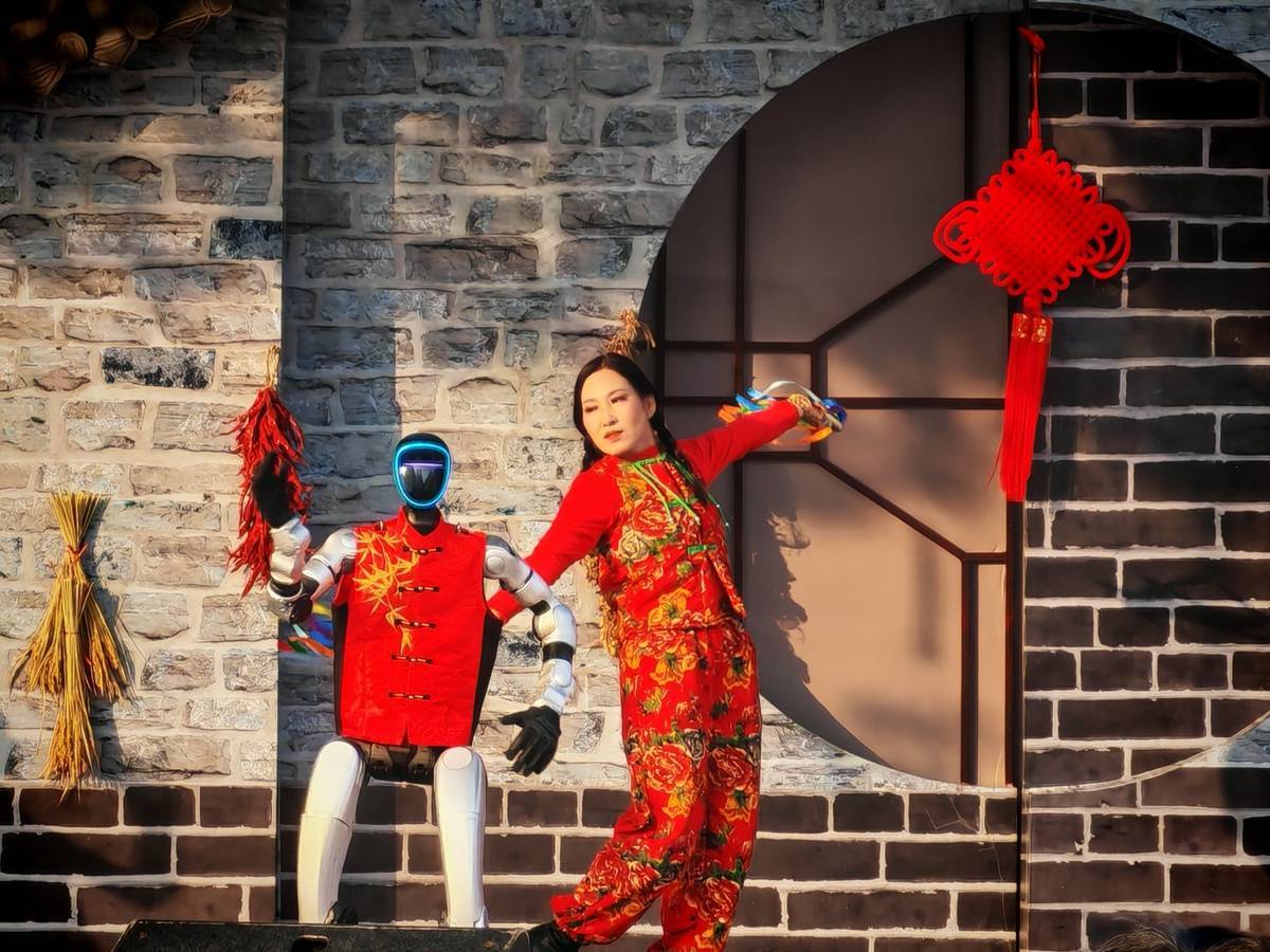 2月10日,大冶上冯村,全国“四季村晚”主场演出热热闹闹开场。压轴的舞蹈节目里,52岁的曹桂香穿着演出服,和机器人同台共舞,笑容满面。