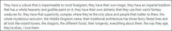 没想到美国人居然认真分析了起来:和神话里的精灵族一样,中国有独特的文化,悠久的传统(中国历史),喜欢龙和神秘的动物(熊猫),吃健康的食物(中餐)。