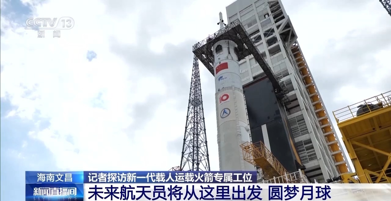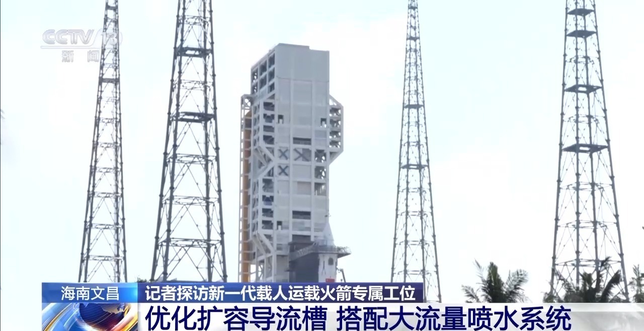 总台央视记者 田若男:远眺文昌航天发射场的三座塔架,从左到右依次是:发射长征七号系列火箭的工位,发射长征五号系列火箭的工位,我国新一代载人运载火箭的专属新工位。可以直观看到,新工位更加修长。