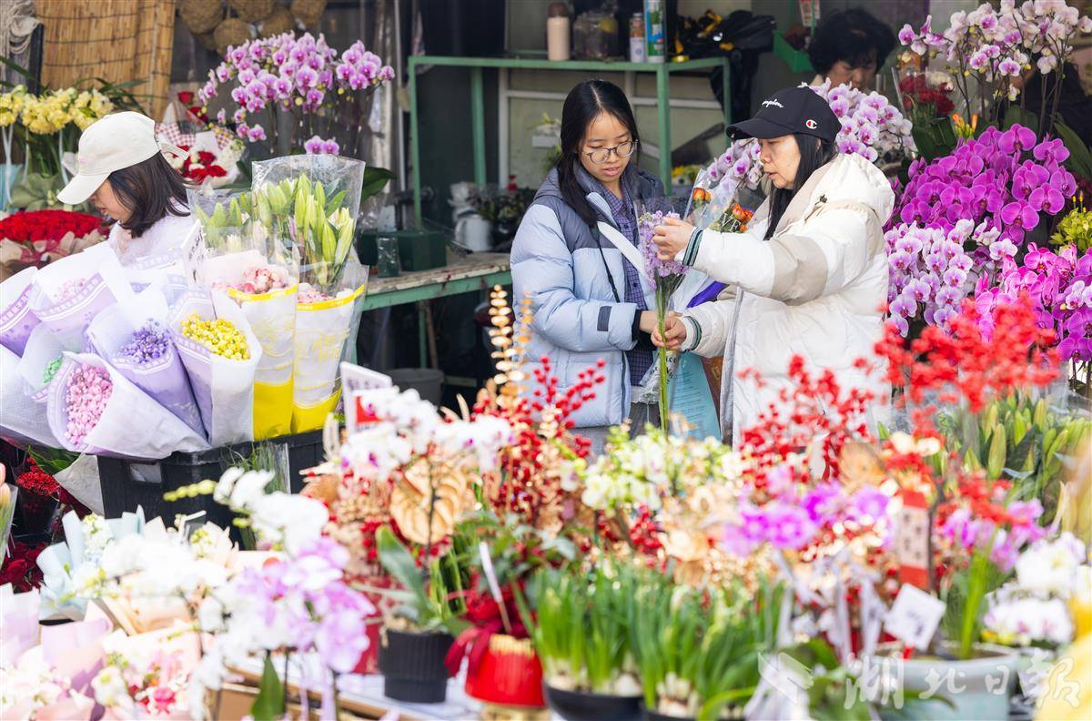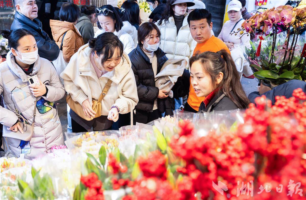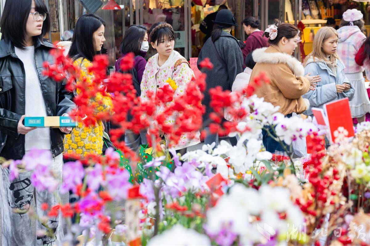 2月13日,武汉循礼门花卉市场,摆满了各式各样的鲜花、盆栽,前来选购的市民络绎不绝,洋溢着喜庆的年味。(湖北日报全媒记者 薛婷 摄)