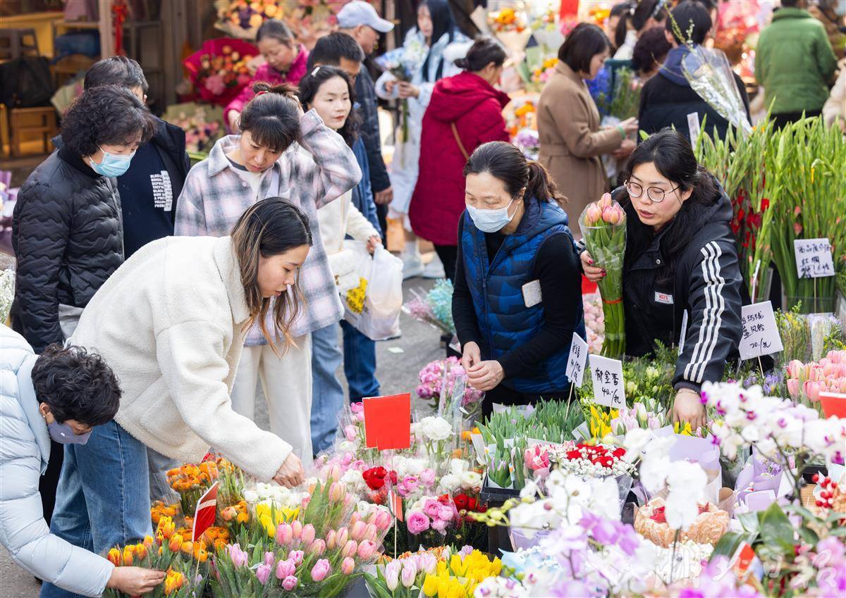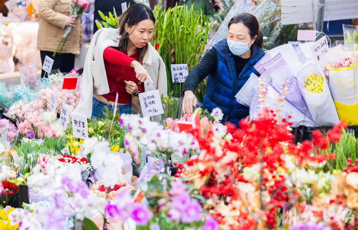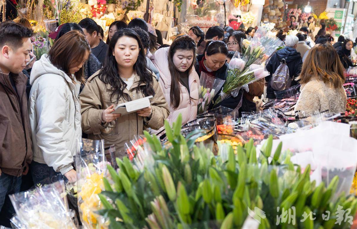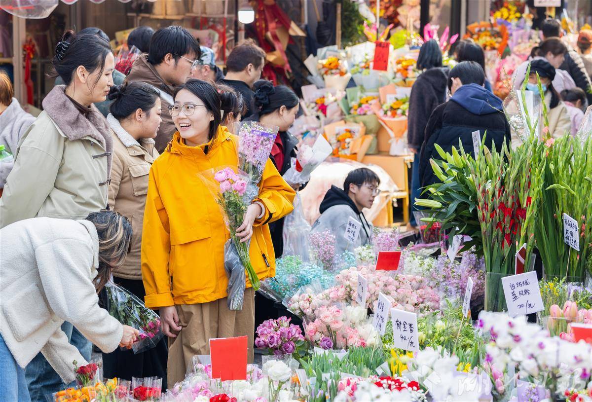 2月13日,武汉循礼门花卉市场,摆满了各式各样的鲜花、盆栽,前来选购的市民络绎不绝,洋溢着喜庆的年味。(湖北日报全媒记者 薛婷 摄)