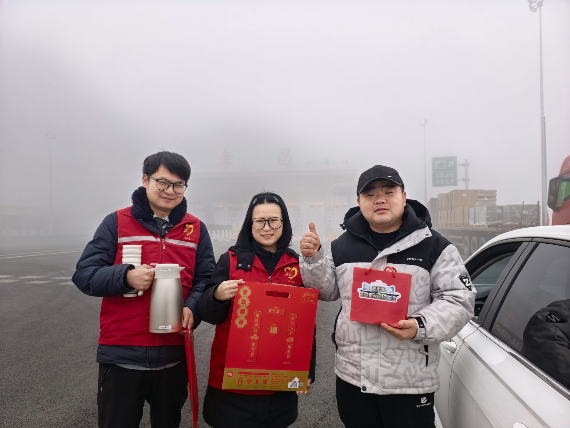 “大雾天赶路又冷又急,一杯热水、一副春联,太暖心了!”王师傅接过礼品,连连为志愿者点赞。此外,志愿者还主动为司乘讲解雾天行车安全注意事项,提醒大家减速慢行、保持安全车距,谨慎驾驶,全力防范各类行车风险。