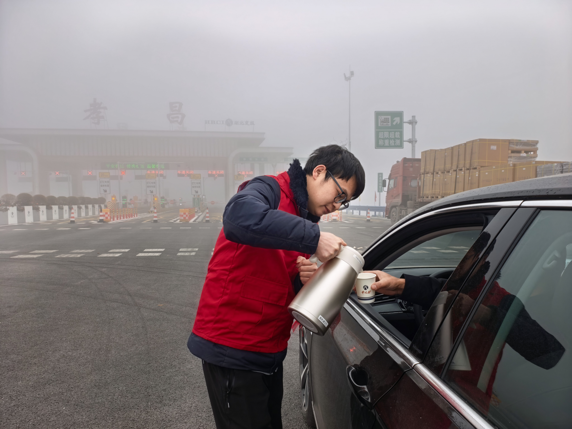 当日,大雾笼罩收费站区域,能见度显著降低。孝昌收费站工作人员提前到岗值守,在做好车道疏导、路况提示的同时,于服务驿站开展常态化春运送温暖活动。“爱路-AiLu”志愿者主动上前,为等候通行、短暂休整的司机师傅们递上热气腾腾的热水,驱散旅途疲惫与冬日寒凉;同步送上精心筹备的春联、福字等新春小礼品,让奔波的司乘在途中感受到暖意与年味。