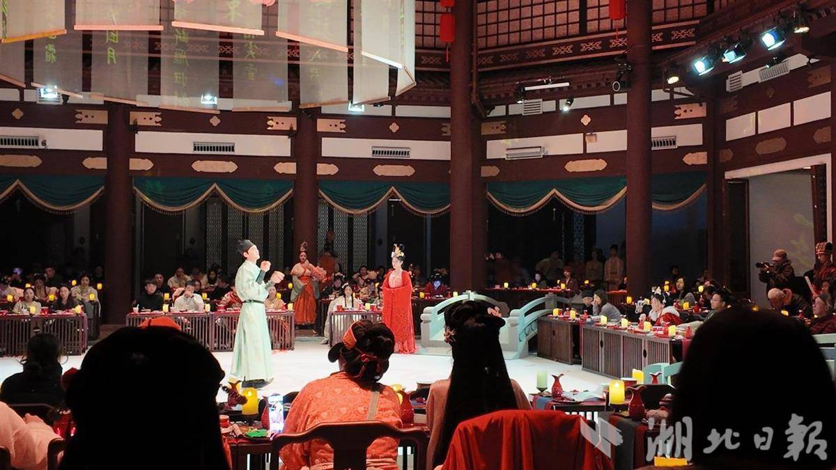 此外,这场宴席还实现了“食与景”的呼应。随着剧情推进,身着古装的侍女会奉上与桥段对应的楚菜美肴——鱼糕鲜美、黄陂三鲜滋味醇厚,每一道菜都在演绎一段历史故事。在2小时左右的体验中,真正实现“视觉、听觉、味觉”的三重沉浸。