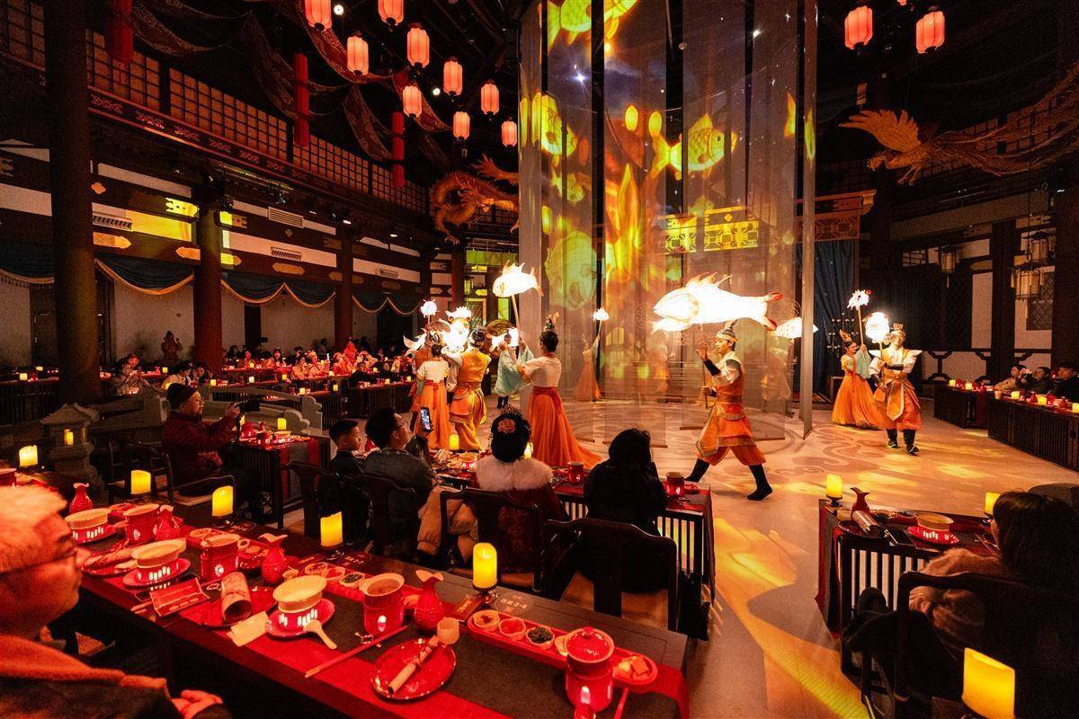 湖北日报讯(记者冯袁玥、杨千帆、通讯员汪鹏、唐云翔)在龟山之巅,与“周瑜”“貂蝉”等三国人物同席,一边品尝荆楚佳肴,一边观看鱼灯舞、飞天舞等演艺大秀——临近农历新年,这顿“能吃能看能玩”的别样古风年夜饭,正吸引不少外地游客慕名打卡。