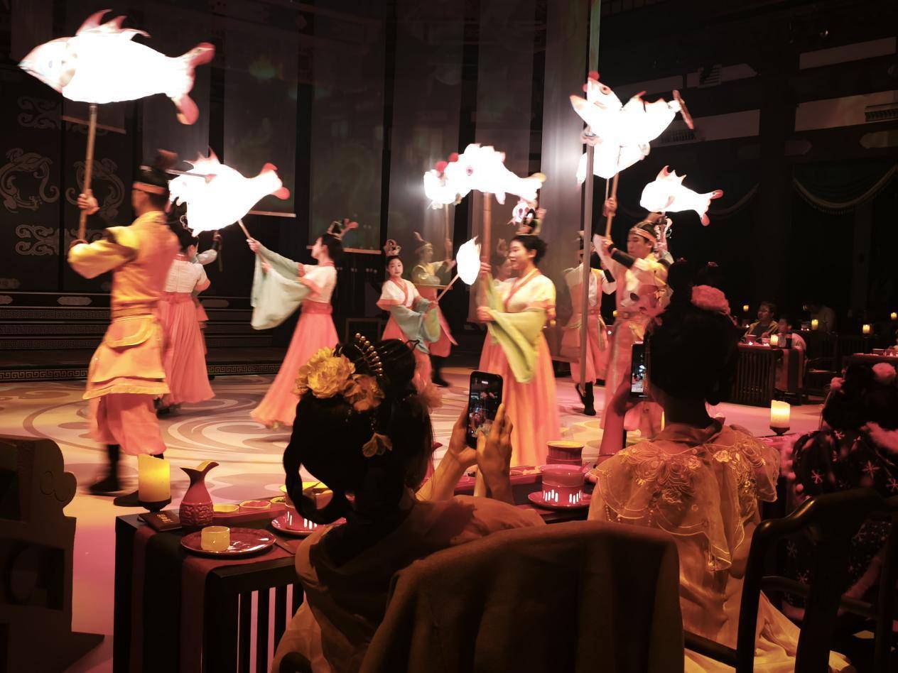 来自福建的黄女士带着女儿小婳身着一身汉服前来体验:“这个表演和菜肴搭配得很好,边看边吃,感觉热热闹闹地很有过年的感觉,就像除夕夜边看晚会边吃饭,算是体验了一把古风年夜饭,很新颖的一次尝试。”