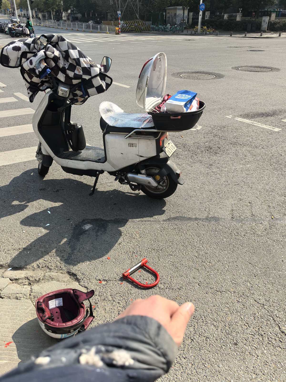 路过宝通寺路的武商梦时代时,考虑到不要逆行,记者在路口急转了一下车头。电光石火一瞬间,可能是车胎打滑,车辆迅速失去了平衡,我连车带人摔在地上,快递货物、头盔及电动车上的物品散了一地。