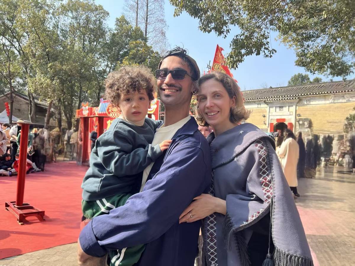 在武汉一所私立学校任职外教的龙斯德一家三口,在大余湾庙会现场合影。