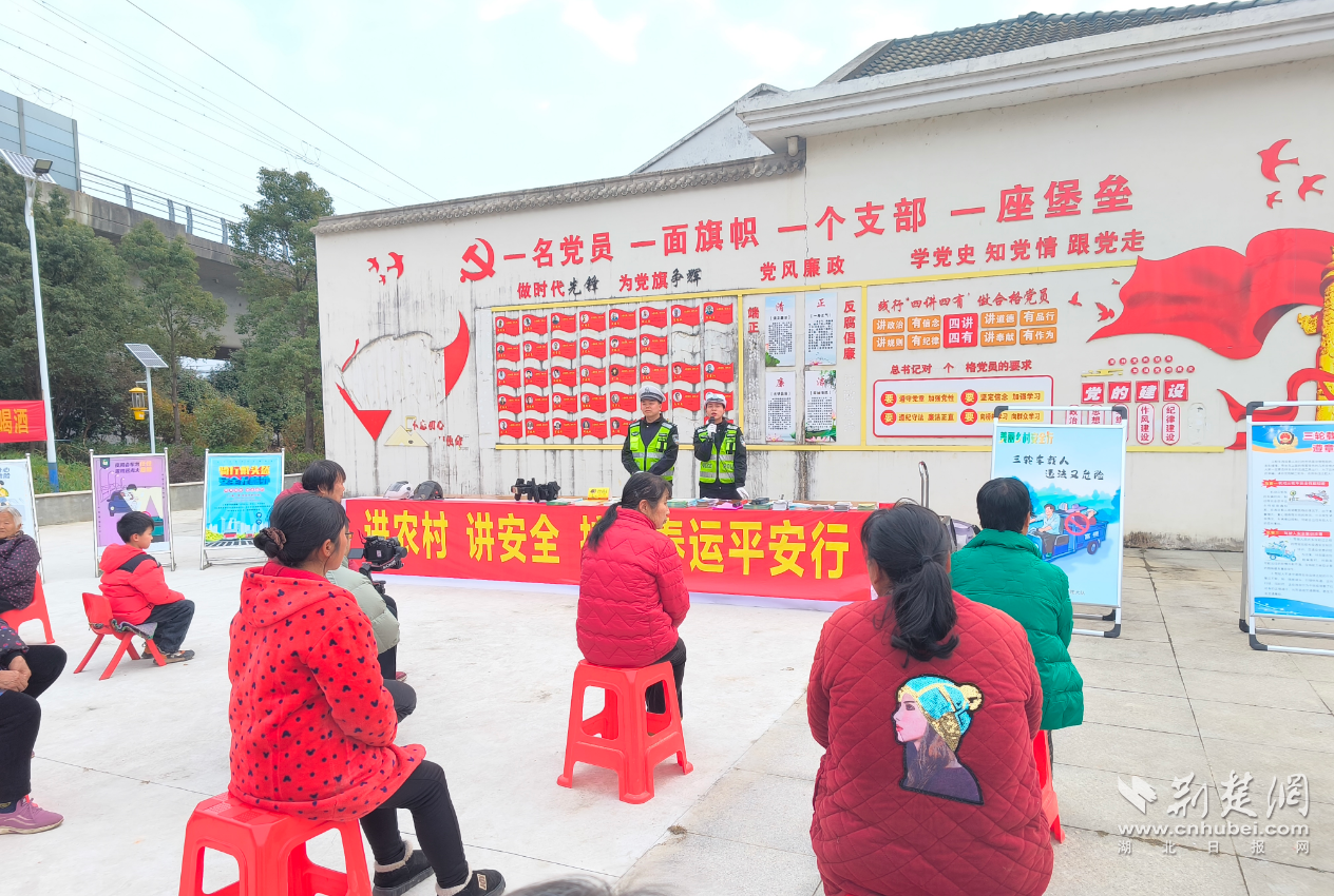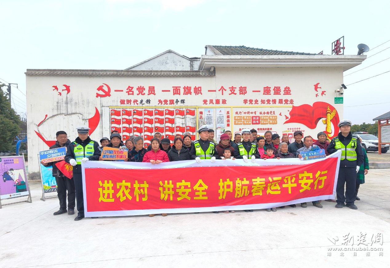 荆楚网(湖北日报网)讯(通讯员曾承兴、王娑娜)2月5日,湖北省公安厅交通管理局联合新华网、湖北广播电视台、孝感市大悟县公安局交通管理大队,走进大悟县大新镇八口塘村,开展“美丽乡村行”春运交通安全主题宣传活动,用村民听得懂、看得见、用得上的方式,将平安送到家门口。