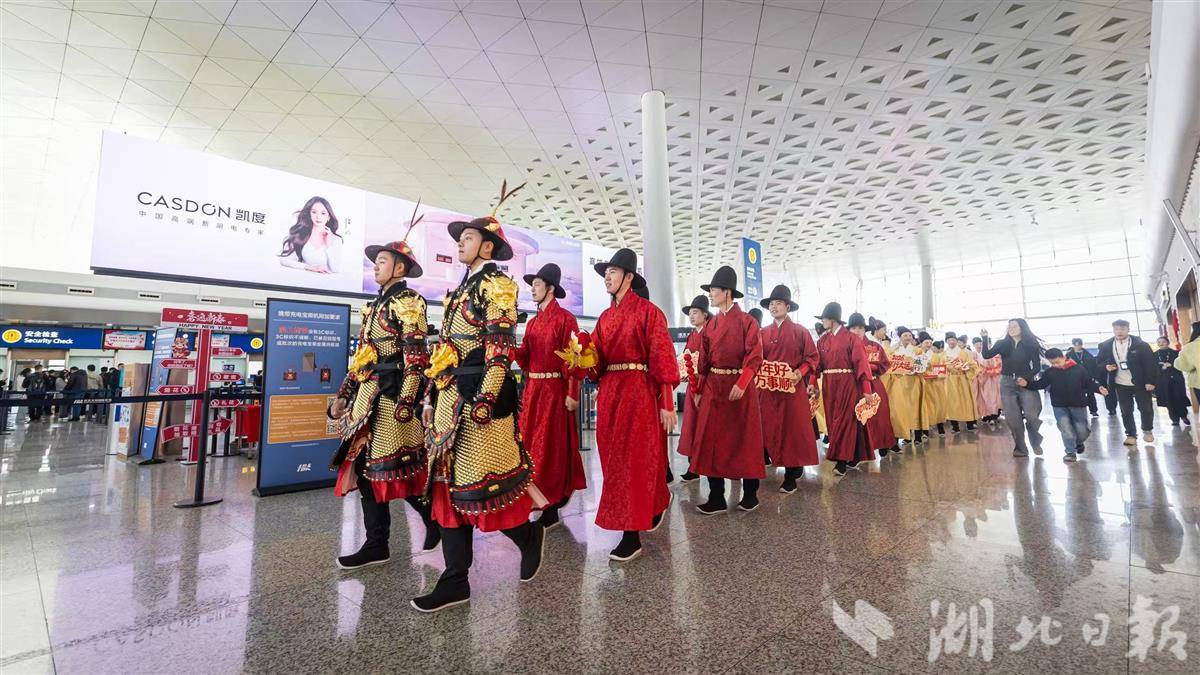 湖北日报讯(记者杨千帆 通讯员吴凝、饶晗)2026年2月14日,正值春运返程高峰,武汉天河机场航站楼内人流如织。与往日匆匆赶路的景象不同,出发大厅俨然一座穿越时空的舞台——伴随着“明韵满天河 新春启华章”主题活动的开启,身着明制汉服的工作人员穿行于人群之间,衣袂翩跹,揖礼相迎,将古典风雅悄然注入现代空港的繁忙脉搏。