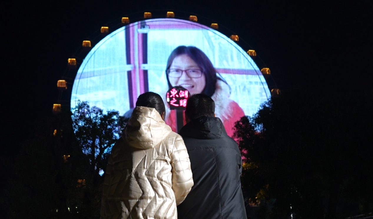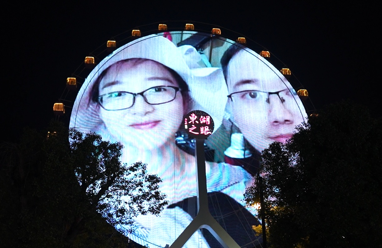 节日前夕,东湖之眼面向全网征集爱情故事,最终挑选出五对不同年龄段的情侣与夫妻。情人节当晚,他们的合影被投上东湖之眼的巨幕大屏,成为夜幕中最动人的画面。