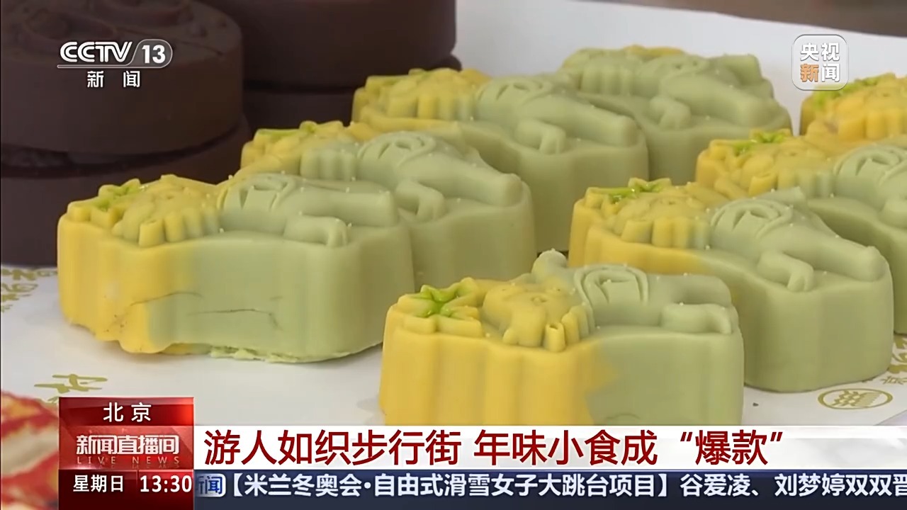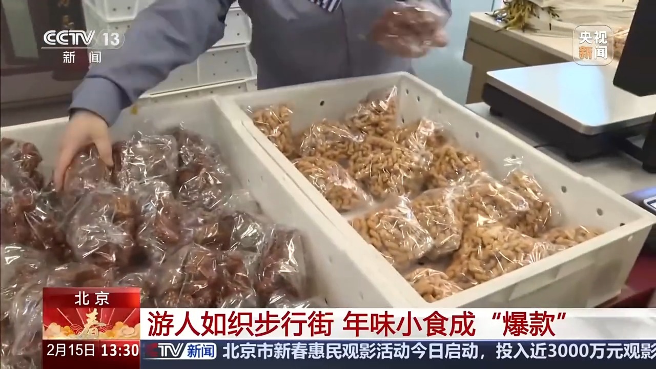 临近春节,北京市东城区的隆福寺街区游人如织,市民游客来到这里买年货、享年味,而在花样繁多的美食中,蜜三刀、奶油麻花和开花枣这三样寓意美好的小点心,更是销售火热。