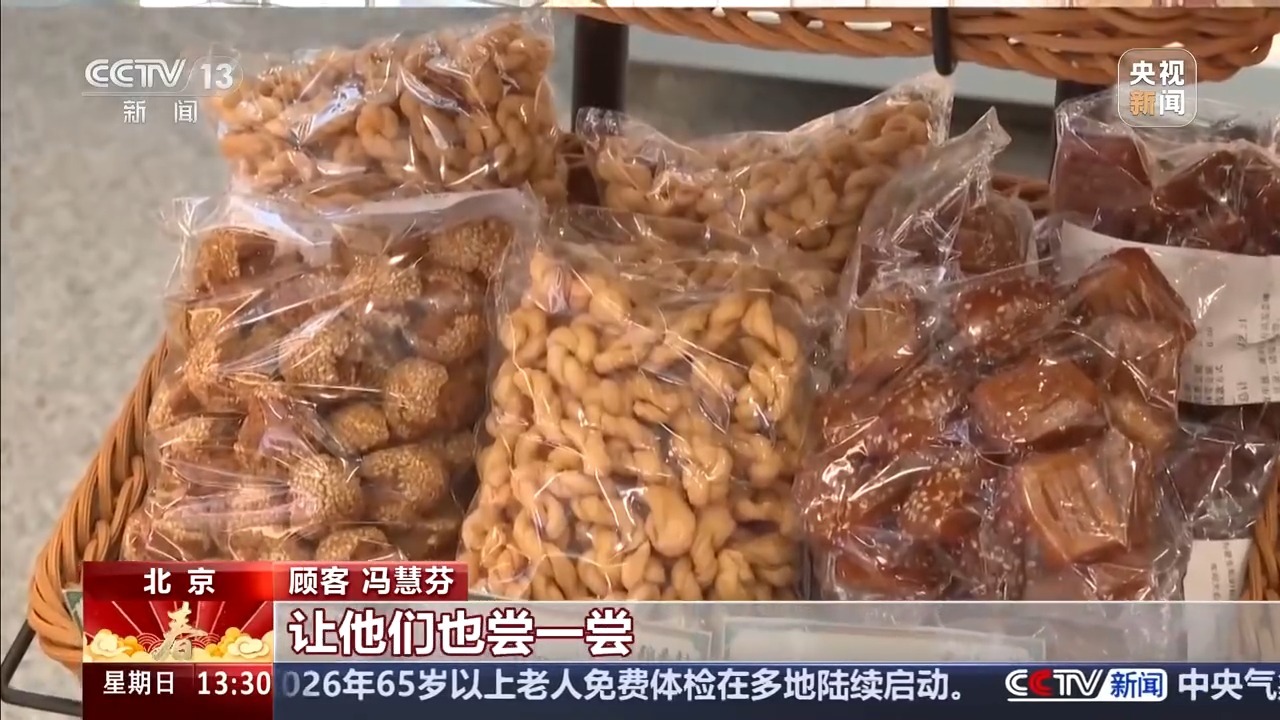 总台记者 马欣欣:我现在是在北京稻香村的零号寻宝馆,在我身旁收银台的面前已经排起了长队。这个就是现在的“爆款”三件套的产品——开花枣、蜜三刀和奶油味麻花。据店员介绍,今天上午,他们就补了足足1000斤的货,但是中午就差不多卖完了,现在正在紧急补货中。有的顾客一买就买了一家人的分量,说把这份美味带回给家人尝尝。