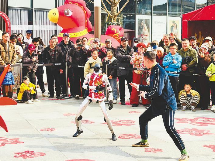 2月15日,腊月二十八,武汉汉阳区新春非遗民俗文化活动举行,机器人与非遗传承人共同表演《咏春》及太极拳,机器人还向市民拱手作揖,送上科技范儿十足的马年新春祝福。(湖北日报全媒记者 李溪 摄)
