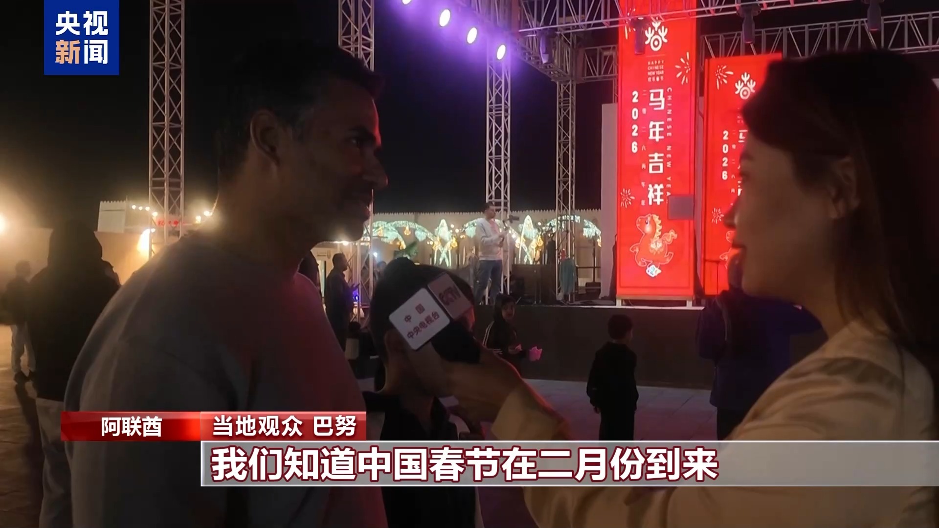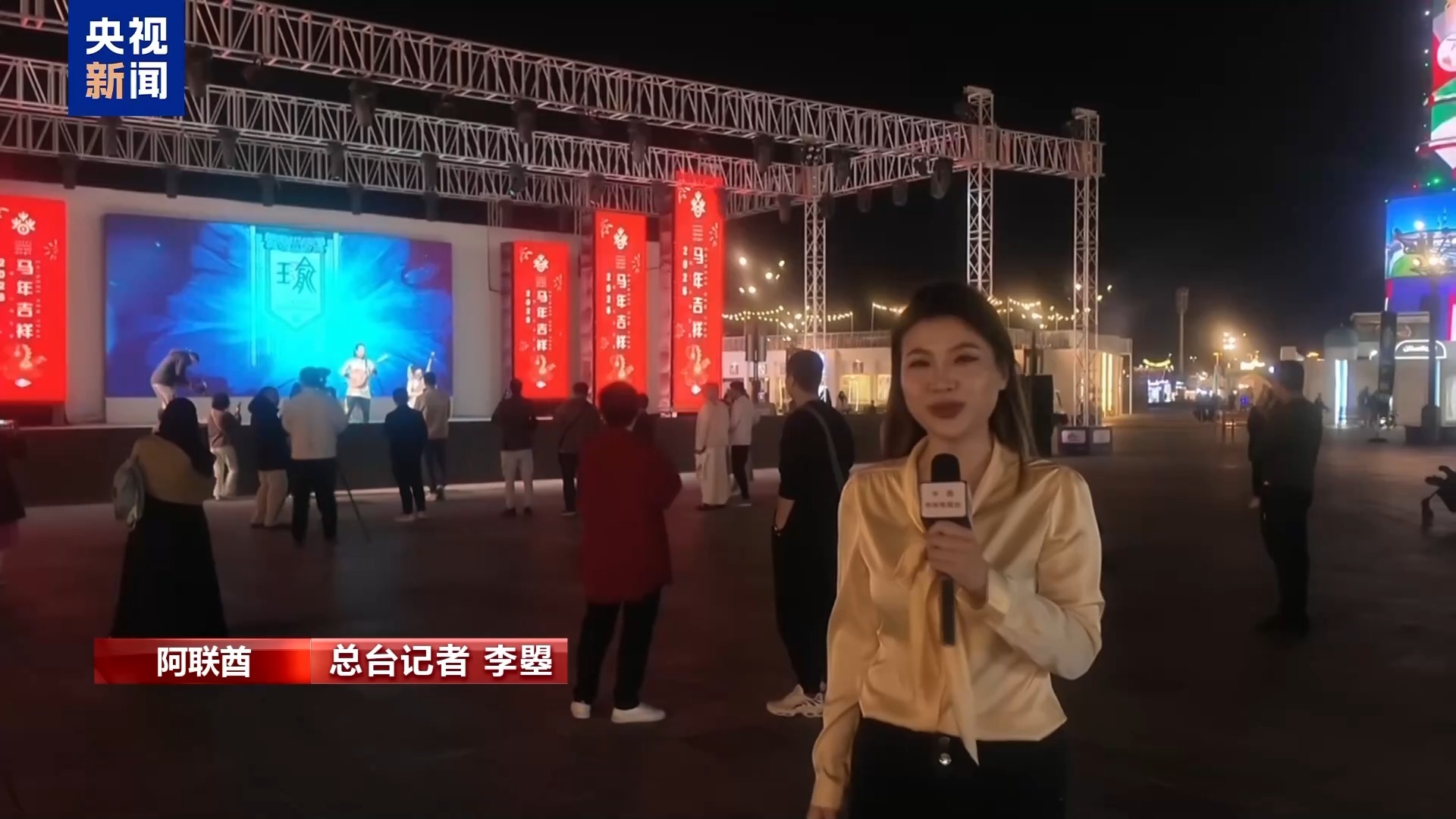 总台记者 李曌:这里是阿联酋首都阿布扎比。在我身后,2026阿布扎比“欢乐春节”中国国潮音乐会正在如火如荼地进行当中。在这里,演员们将中国传统音乐与现代节奏巧妙融合,为阿联酋当地观众带来了一场跨越文化与语言的视听盛宴。